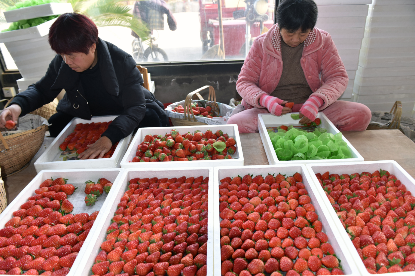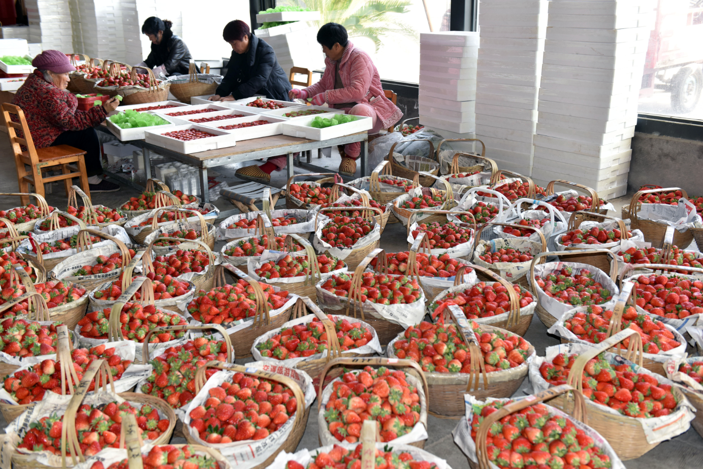 12月24日,在金义新区江东镇芦村一家家庭农场生态园草莓基地,种植户将刚采收的优质草莓进行分拣、包装。据了解,全镇共有草莓种植面积2300亩,总产量达到4500吨,该项产值占农业总产值的30%。产品主要畅销上海、杭州、绍兴等地。 近年,该镇大力推广大棚生态草莓种植,通过专业合作社的运作模式,带动广大农民增收致富。