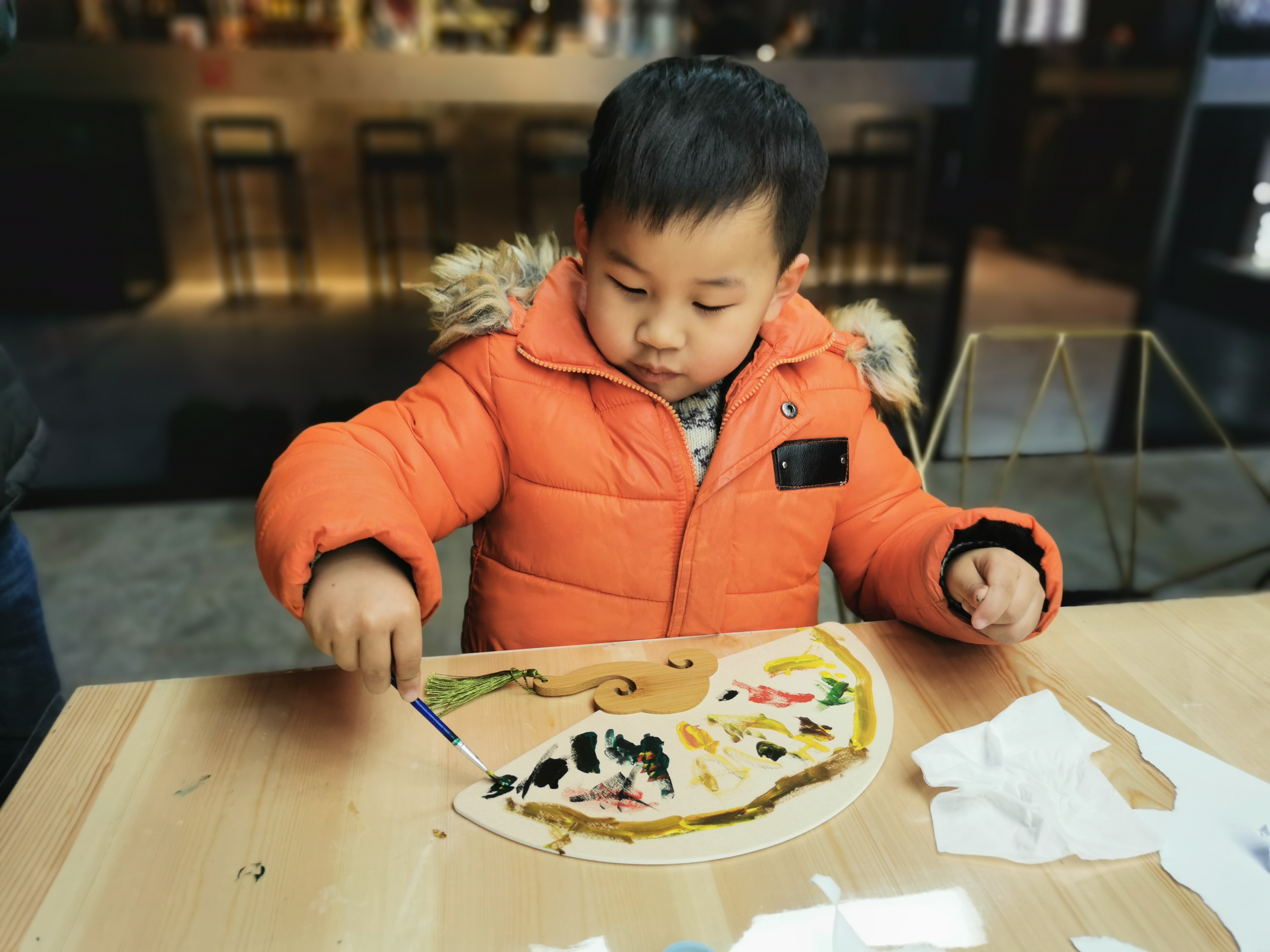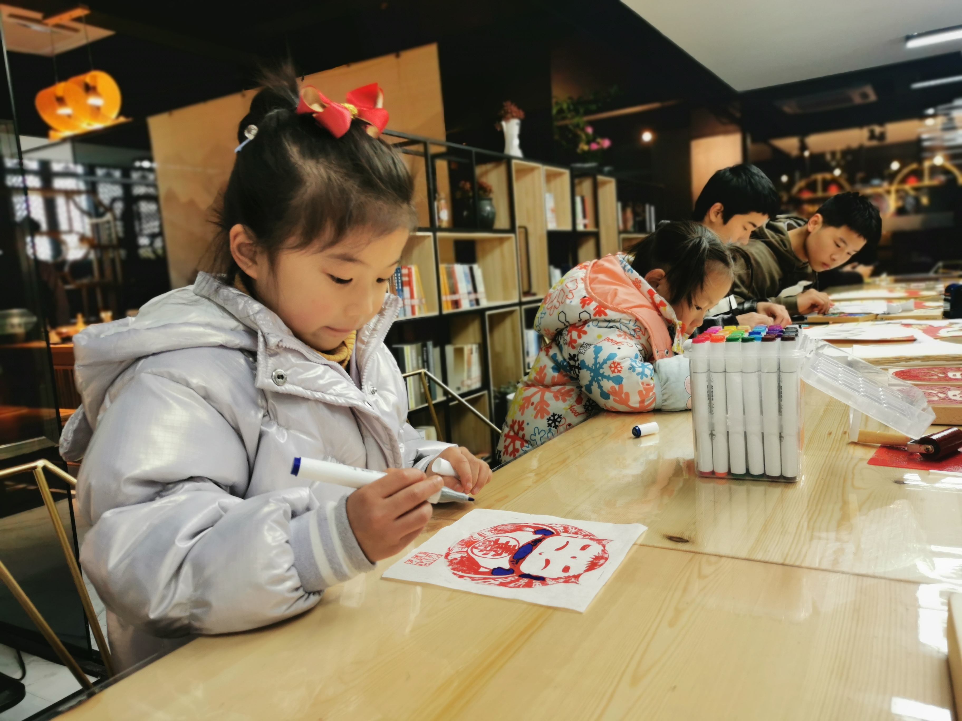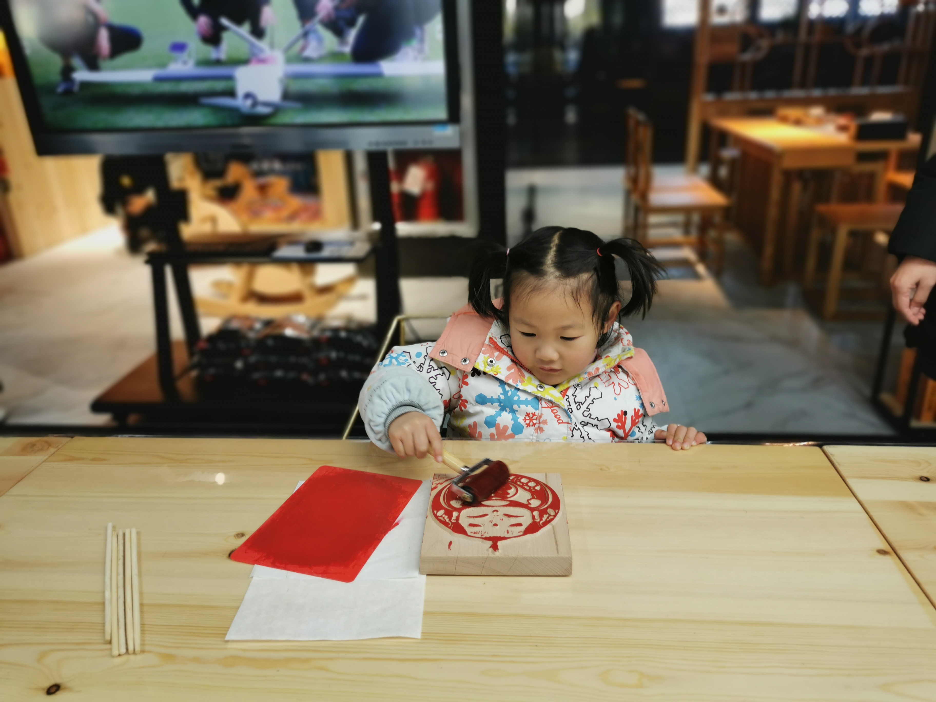 孩子们拓印木版年画、手绘蒲扇、做竹蜻蜓,大人们彩绘日历、体验茶艺,或在水吧边喝边聊。