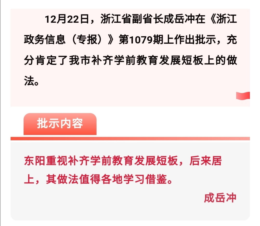 顾在响:我们把学前教育“补短提升”视作“一把手”工程,针对学前教育普遍存在的“城乡基础差异大、普惠优质资源少、师资队伍质量低”等突出问题,实施“三类结构、两级联盟、三项举措”的“三二三”增效模式,促进学前教育提档升级高质量发展。2019年,东阳学前教育补短提升工作获省政府督查激励。