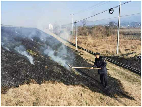 冬季气候干燥,容易诱发火灾,一旦失火,极易造成大面积火势蔓延,造成不可挽回的损失。1月18日下午4时,香溪中队接到举报,反映防洪堤坝的护坡草坪发生火灾。考虑到护坡草坪现阶段枯黄干燥,火势极易蔓延,影响防洪堤坝的安全,香溪中队中队长范建华拿上铁锹等工具,与中队队员立即赶往现场。赴路途中,范建华第一时间向相关领导汇报并联系民工,确保短时间内遏制火势蔓延。