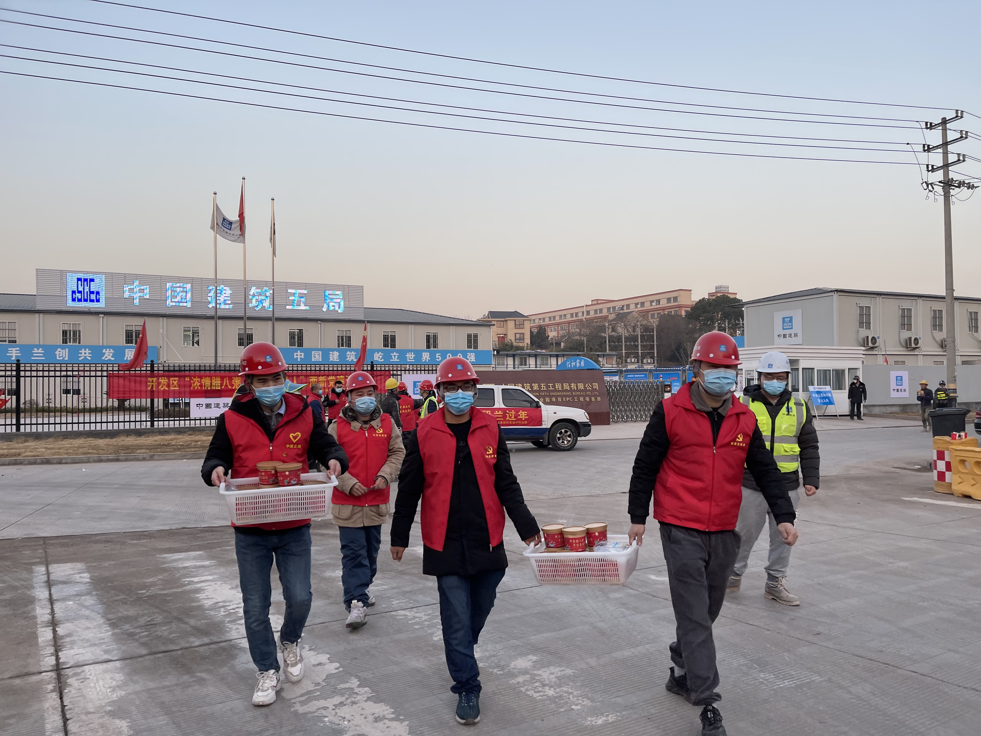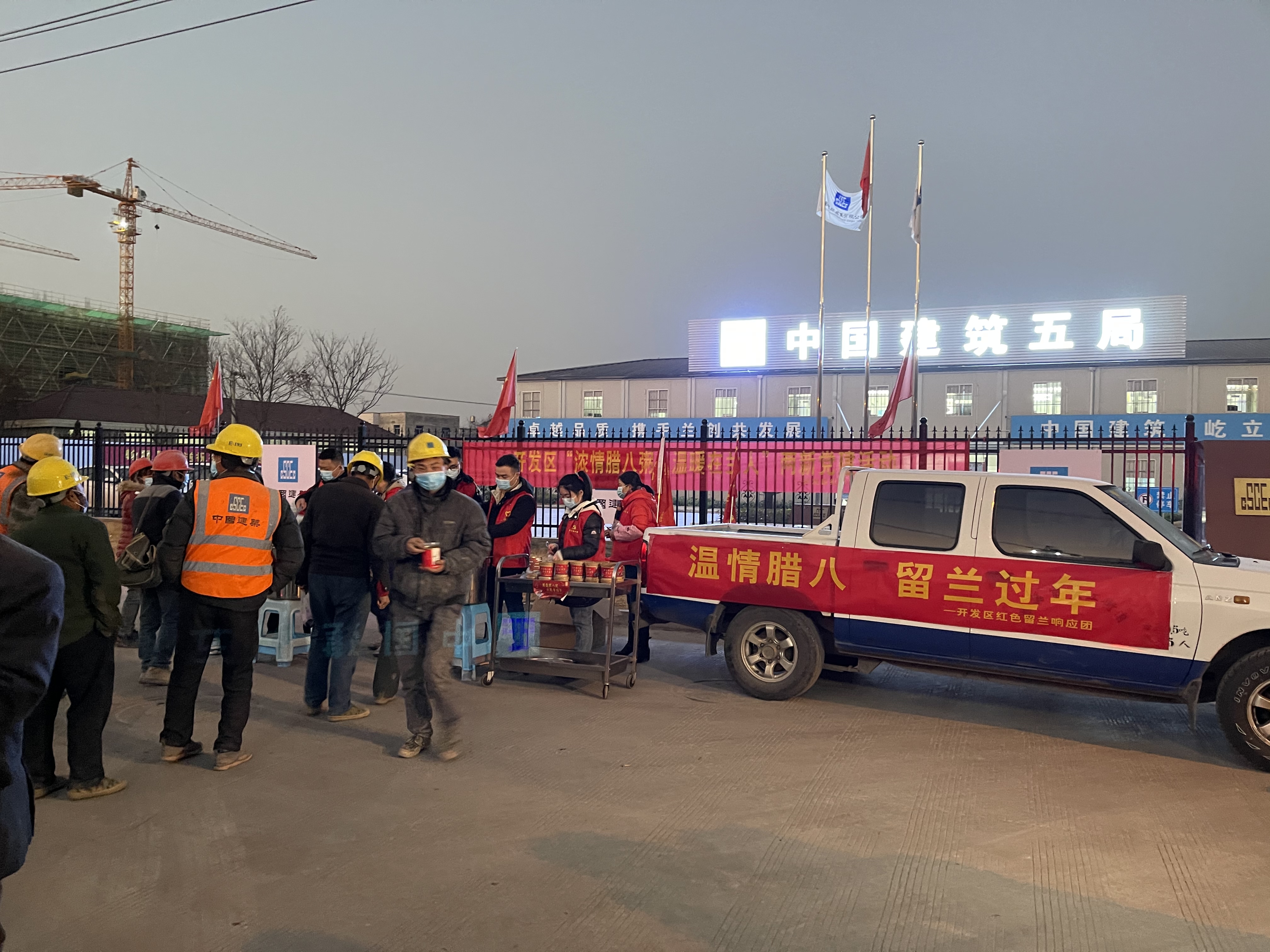 六点不到,满载腊八粥的皮卡车就停在了24小时不停工的区欣旺达项目工地建设现场。为了项目能尽快落地投产,现场依然有七八百号民工日夜奋战,坚守建设一线。明天就是中建五局欣旺达项目喜结金顶的日子,以往六点多上班的务工人员今天要继续赶工,起得更早了,大家戴口罩,排队有序领取腊八粥。