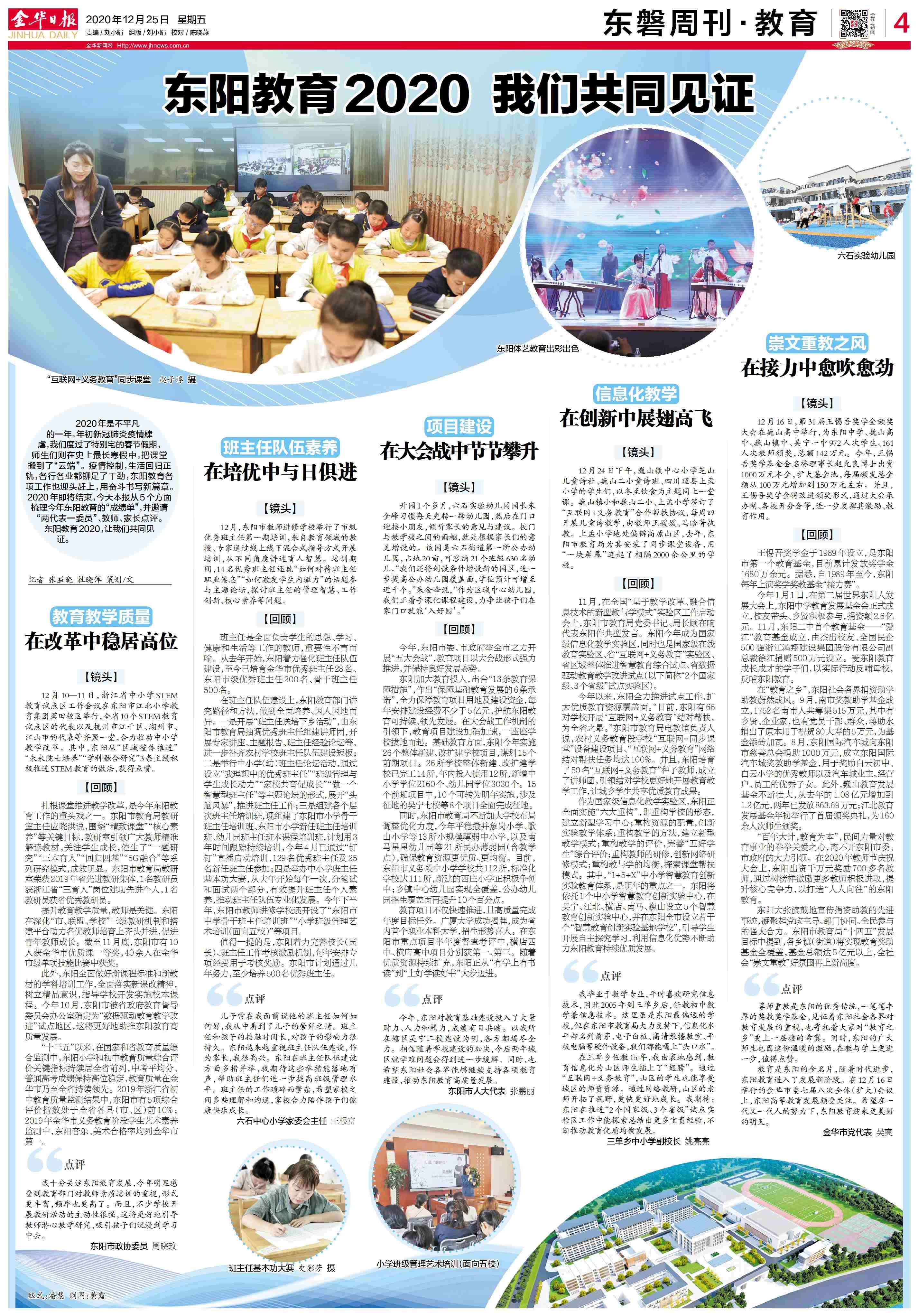 近年来,东阳奋力实施学前教育发展第三轮三年行动计划,学前教育补短提升工作跨越式发展,获省政府激励;副省长成岳冲作出批示:“东阳重视补齐学前教育发展短板,后来居上,其做法值得各地学习借鉴”;《中国教育报》两次头版报道了东阳优先发展学前教育的工作经验。群众要求上优质园的需求得到缓解,获得感明显提升。