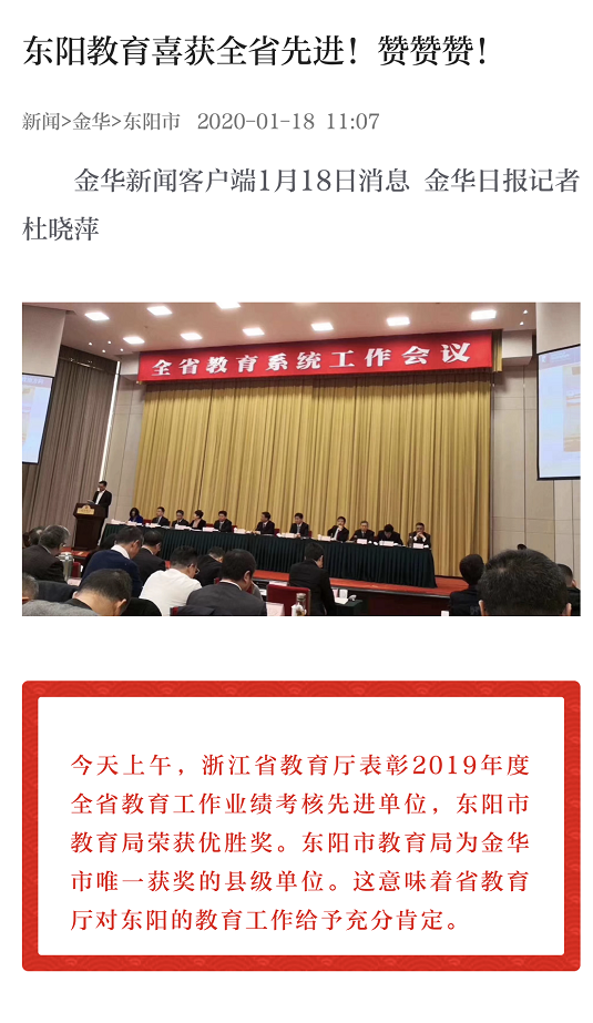 这是一条冒着热气的新闻:刚刚,全省教育工作会议传来喜讯,东阳市教育局获评2020年度全省教育工作业绩考核先进单位,系全省20个获此荣誉的县(市、区)教育局之一。东阳市教育局党委书记、局长顾在响在会议现场领奖。