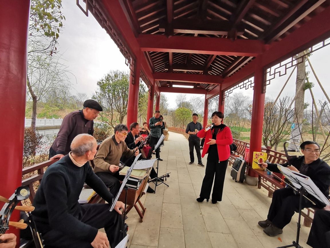 “哪里风景好,我们就去哪。”今年76岁的王启生是文艺爱好者,这天,他带领乐队成员来到此处,“我是在微信朋友圈看到这个地方的,自己先跑来‘考察’了一番,真是不错”。环境好、空气好,一行人对此赞不绝口,拿出二胡、笛子等乐器就演奏开唱了。