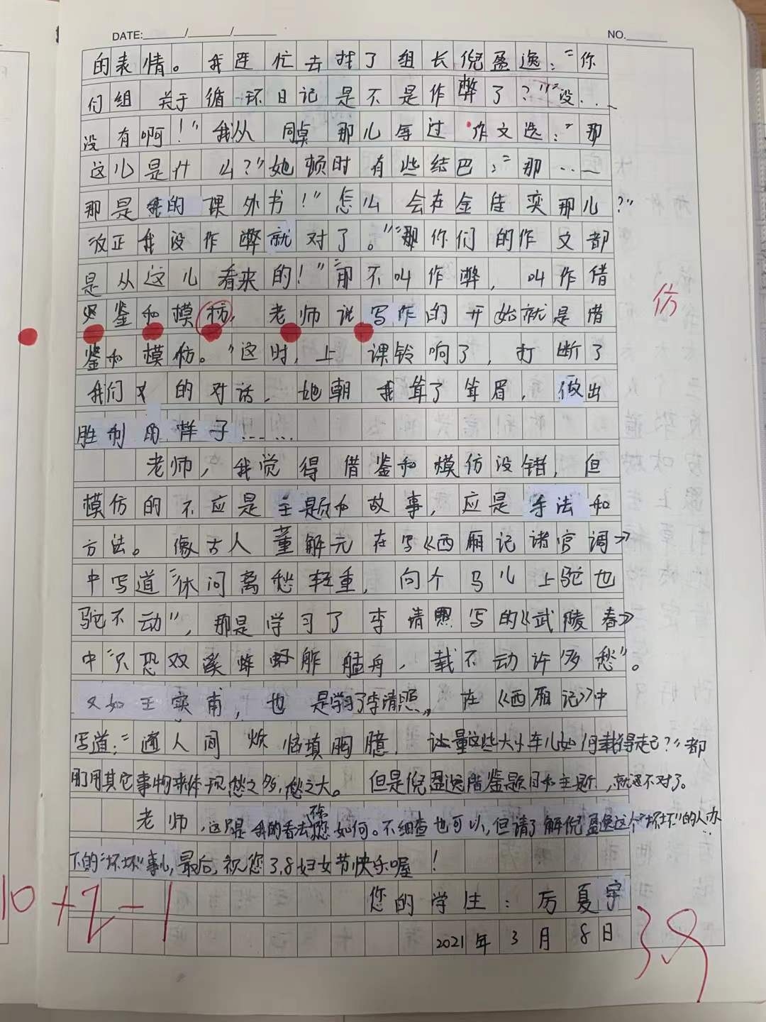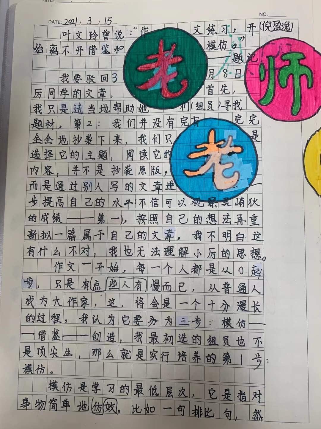 “我要驳回厉同学的文章。”一周后,倪盈逸通过日记进行反驳。她认为,写作分“三步走”——模仿、借鉴、创造,模仿是学习的最低层次,借鉴要用批判的眼光取其精华、去其糟粕,创造则是在知识积累到一定程度后,心智与灵感迸发出来的火花。“小吴已经从借鉴前进到创造阶段了,作文从原来的2颗星升到了8颗星。”