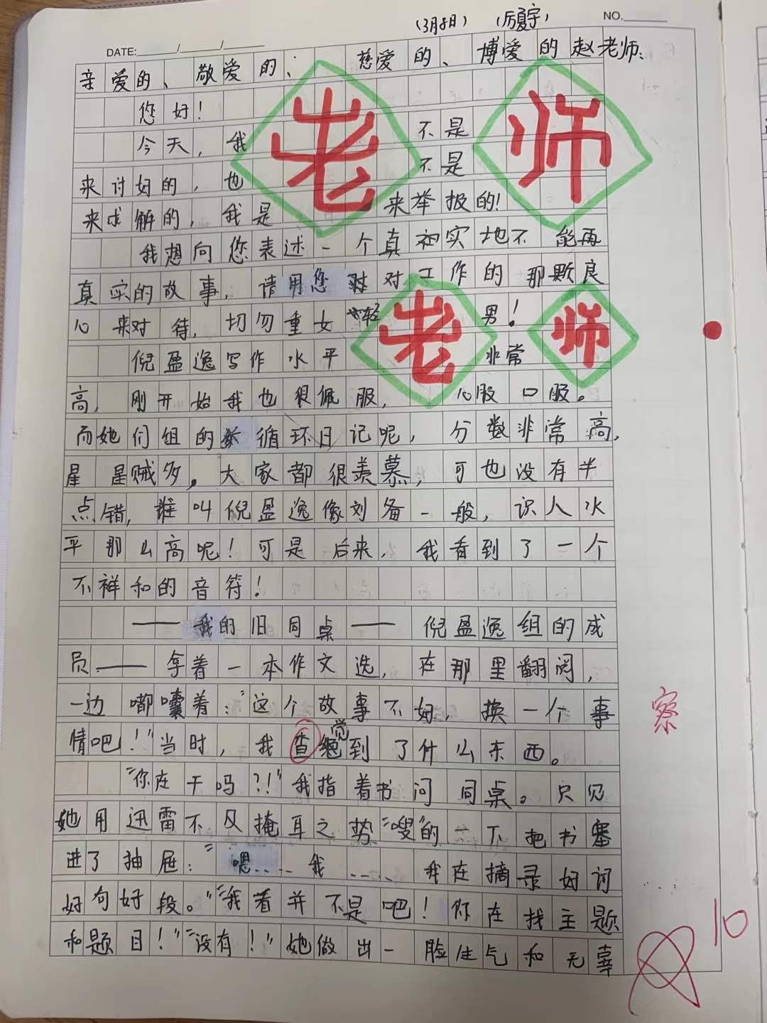 “赵老师:您好!今天,我是来举报的!”3月8日,东阳市巍山第一小学教育集团巍山校区五(4)班学生厉夏宇,在小组的“漂流日记”中写道,“倪盈逸写作水平非常高,刚开始我也很佩服,心服口服。她们组的日记分数也非常高,大家都很羡慕……可是后来,我看到了一个不祥和的音符!”