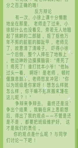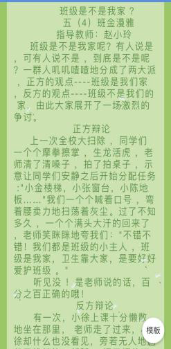 对于“每日一文”,赵小玲有时特意挑选前后对比鲜明的日记,不仅增加阅读的新鲜感,更引导学生进行辩证思考。学生金漫雅的《班级是不是我家?》,通过两件小事来讨论“班级是我家,卫生靠大家”和“班级不是你家,不能为所欲为”两个观点。其他同学看了,直呼“有意思”,觉得“正方和反方都有道理”,通过讨论还明白了日记的题材就在身边。