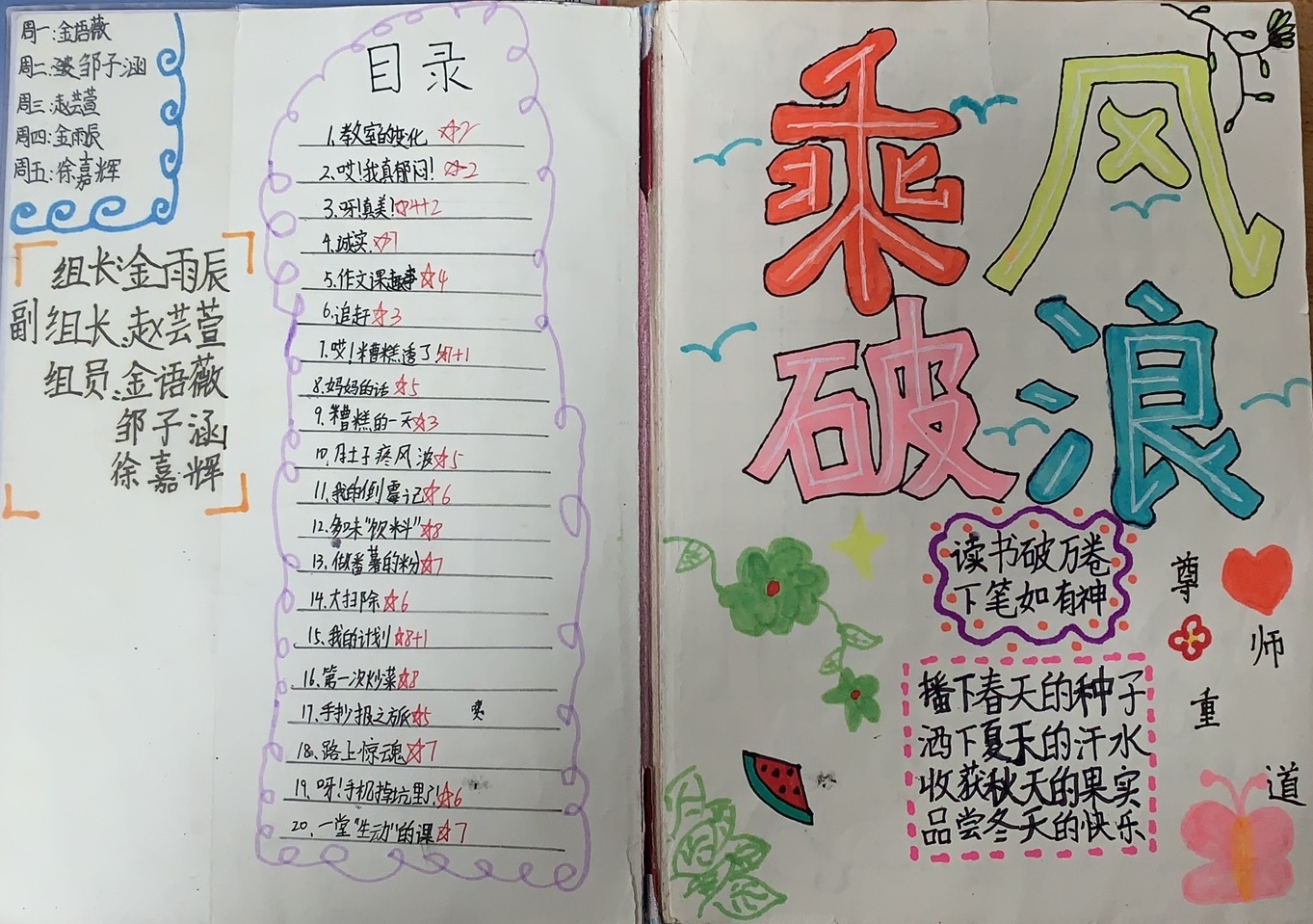 五(4)班共有45名学生,分为11个小组,每个小组设一名组长。“乘风破浪”“梦之翼”“启明星辰”……每一组都有自己的日记本和组名,并确定了周一至周五的日记写作顺序。
