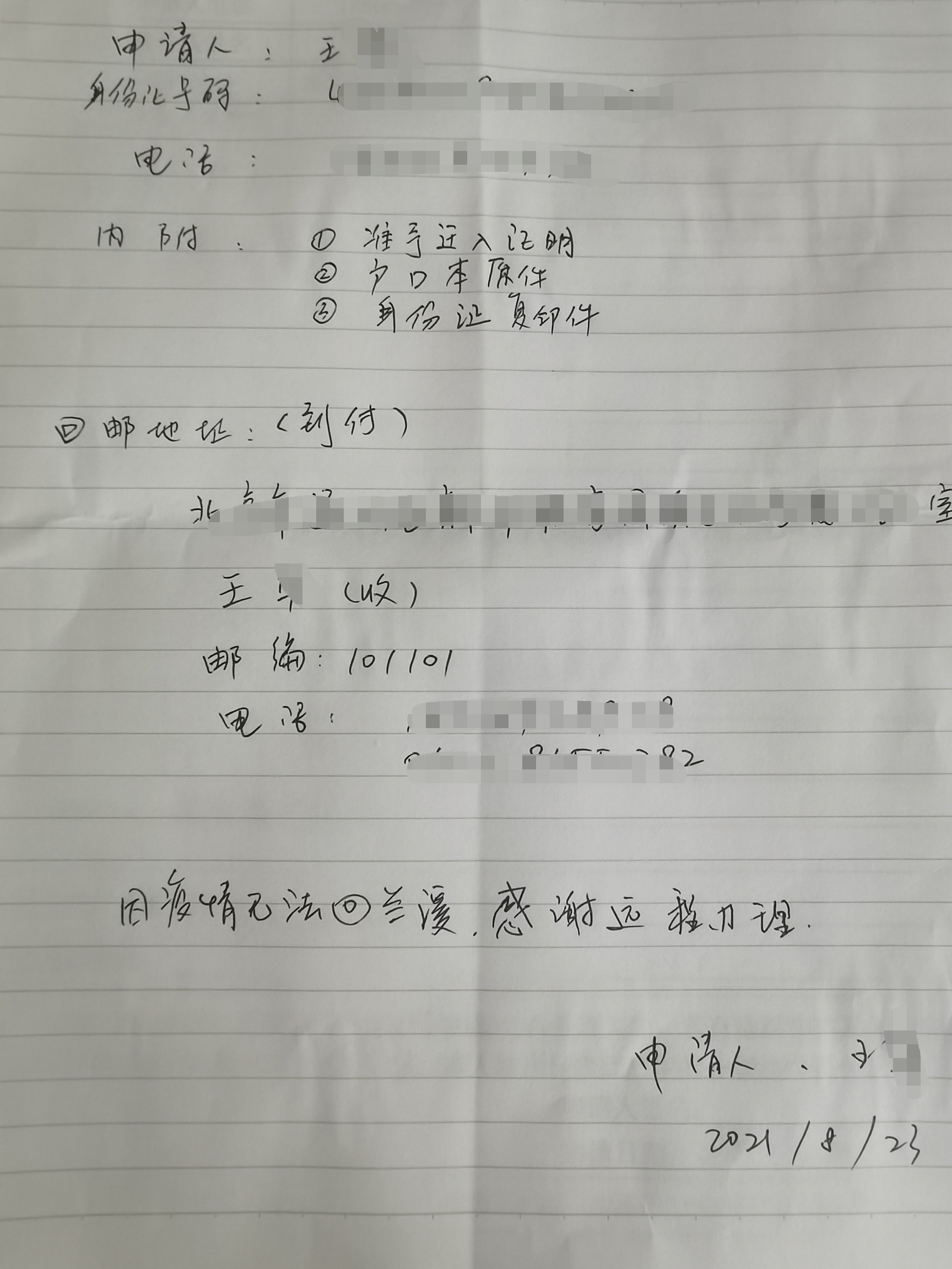 8月24日下午,公安窗口收到王先生寄过来的材料后,立即审核办理,并开具户口迁移证明,第一时间给王先生邮寄到北京,并电话告知王先生。
