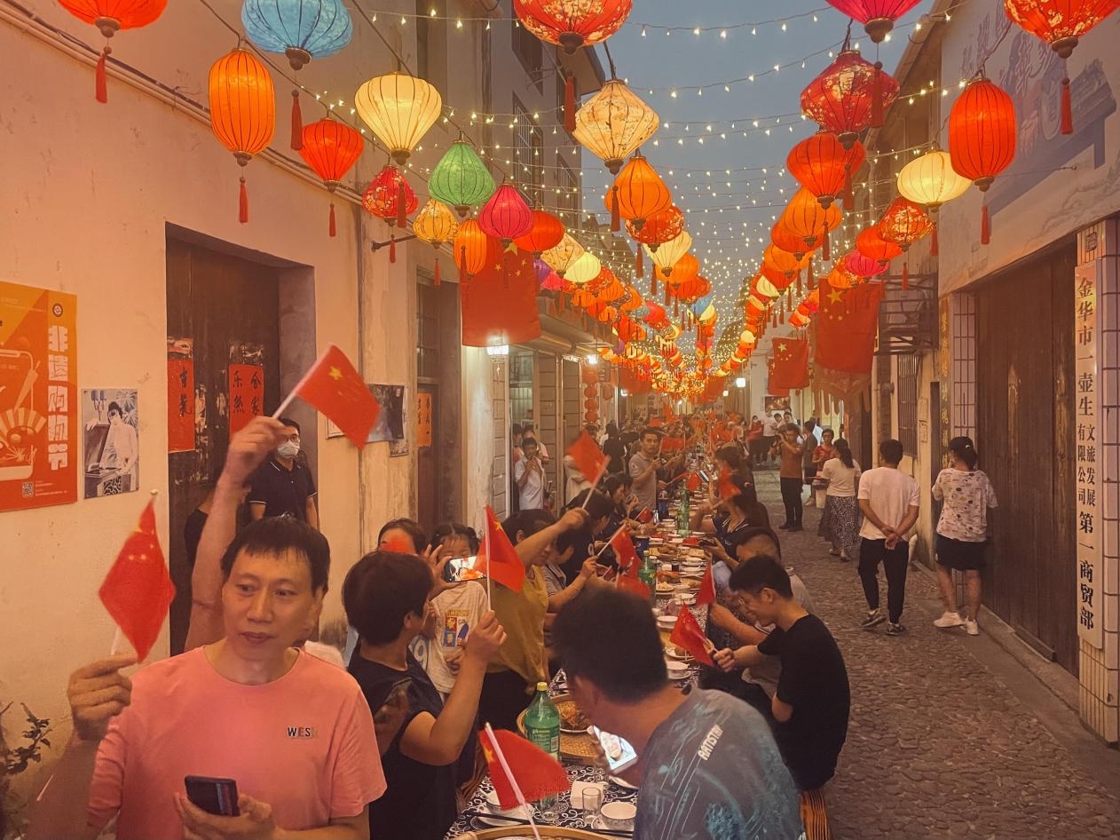 这个国庆假期,兰溪市女埠街道格外热闹,古街上摆出了“长桌宴”,喜迎八方来客,长桌宴上摆满了兰江蟹、童工鱼、凤凰蛋、下潘土索面、汇潭甘蔗等当地美食,还有鸡子粿、葱烧饼、蜜枣一众特色特色小吃,让人馋涎欲滴。现场,击鼓技艺、喜剧小品、变脸等特色节目轮番上演,游客们一边品尝着美食,一边欣赏着民俗表演,精彩的节目让人群中不时响起掌声和喝彩声,宾客们直呼过瘾。