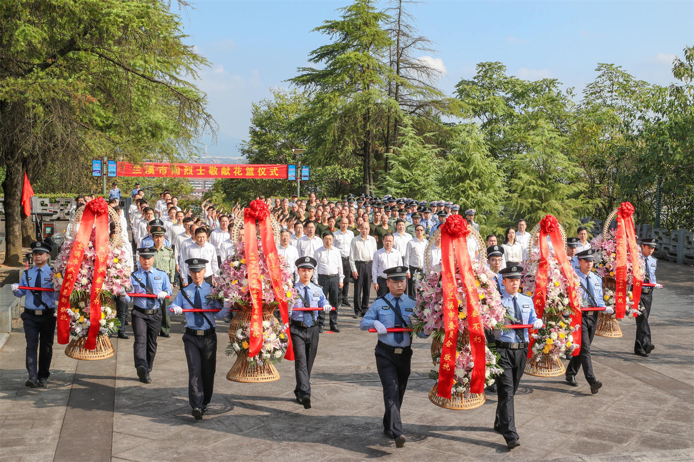丰碑长在,英魂永存。伴随着《献花曲》深情的旋律,礼兵稳稳托起花篮,迈着坚定有力的步伐走到烈士纪念碑前,向革命烈士敬献花篮。市党政军领导陈峰齐、王新锋、刘成芝、徐建祥、陈智军神情庄重地走到花篮前,仔细整理鲜红的缎带。