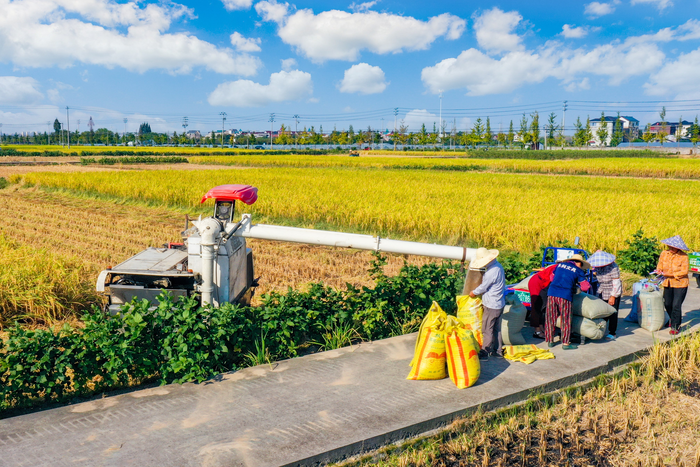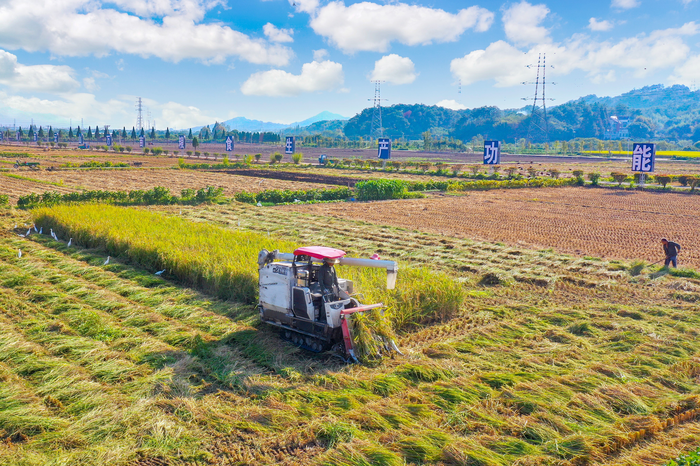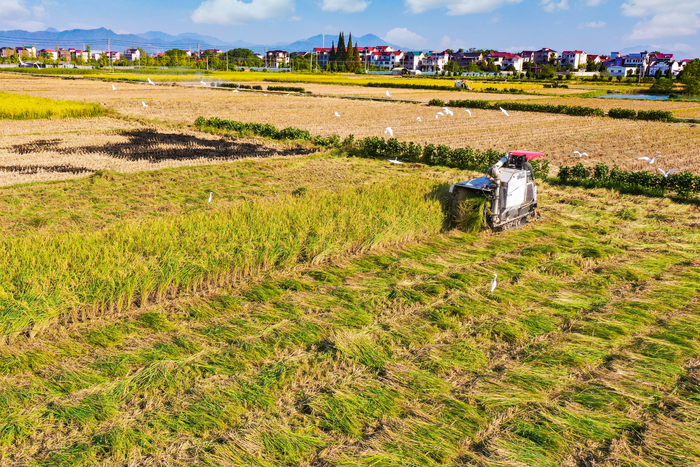 金秋时节,稻穗飘香。在兰溪市云山街道岩头村的万亩粮食功能区,农民抢抓晴好天气,忙着收割晚稻。成群的白鹭追着收割机飞舞、觅食,构成一幅和谐的田园画卷。