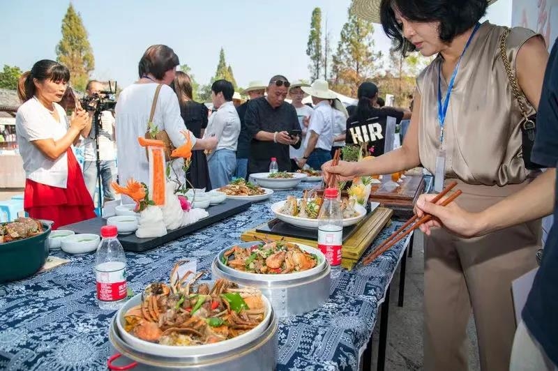 另一边,一场激烈的比赛也在同步进行。皮薄多汁的蟹黄灌汤包、造型别致的蟹黄太极羹、肉质酥软的蟹炖排骨……全民烹蟹宴大赛上,选手们铆足了劲,蒸炒煮炸,各显技艺。热气腾腾的大锅、起伏翻滚的各色美食,让人垂涎欲滴。专业评委与市美食发展中心的“吃讲师”们,以色香味型四个标准进行评判打分。