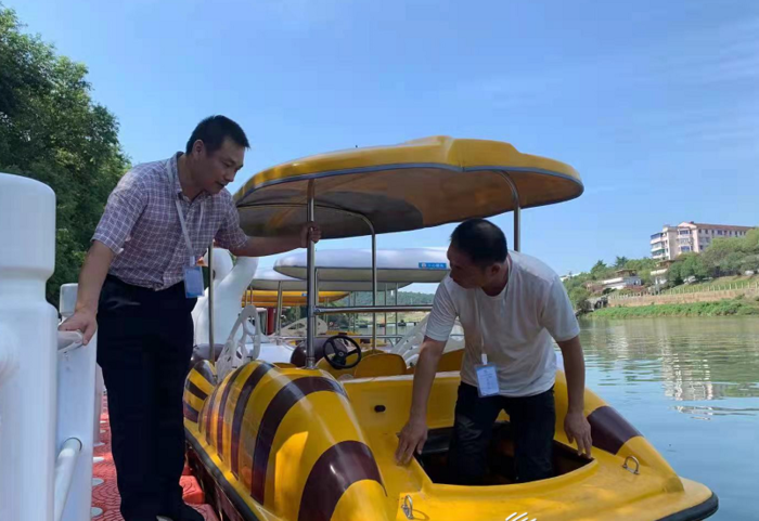 在中洲公园,小黄鸭、白天鹅、小蜜蜂等各式各样卡通船停在兰江上,给江面增添了一道靓丽的风景。工作人员正在对卡通船进行仔细排查,重点检查电瓶的充电情况以及电线连接状态,确保相关设施安全投入使用。