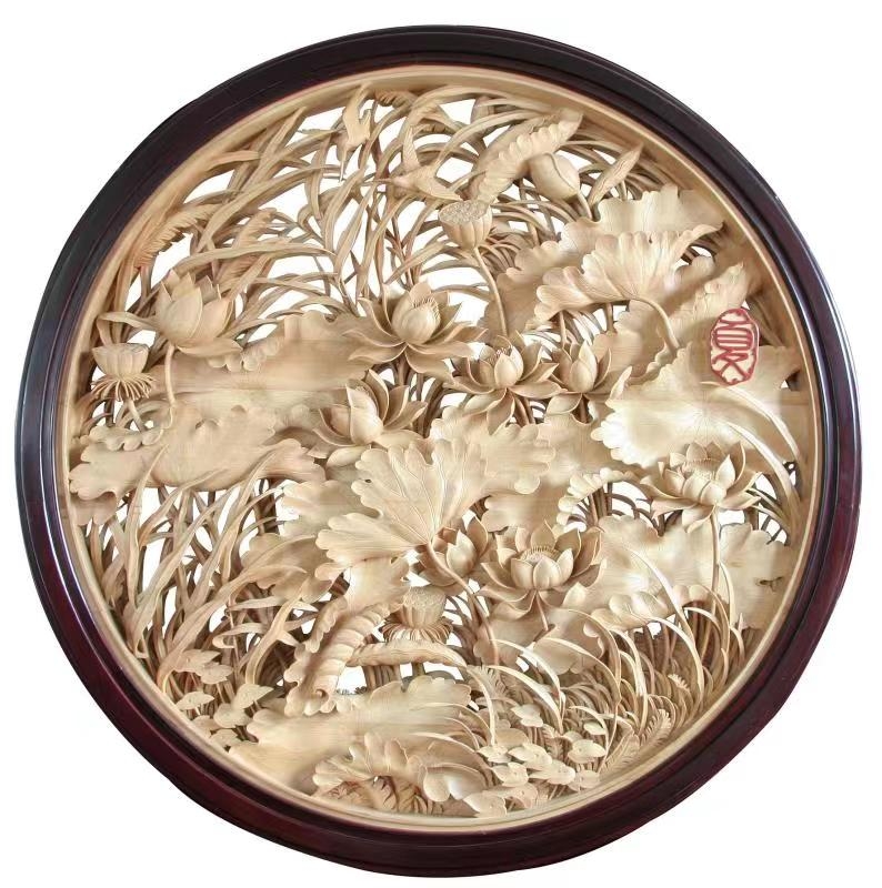 新的技法与设计,也是冯文土创作中的重要追求。在东阳木雕传统技法的基础上,他独创出“半圆雕”,使得木雕作品布局更精巧、层次更加分明。之后,他又相继研发出了“树皮胞雕”“根石雕”等众多技法,不断丰富东阳木雕的内涵。