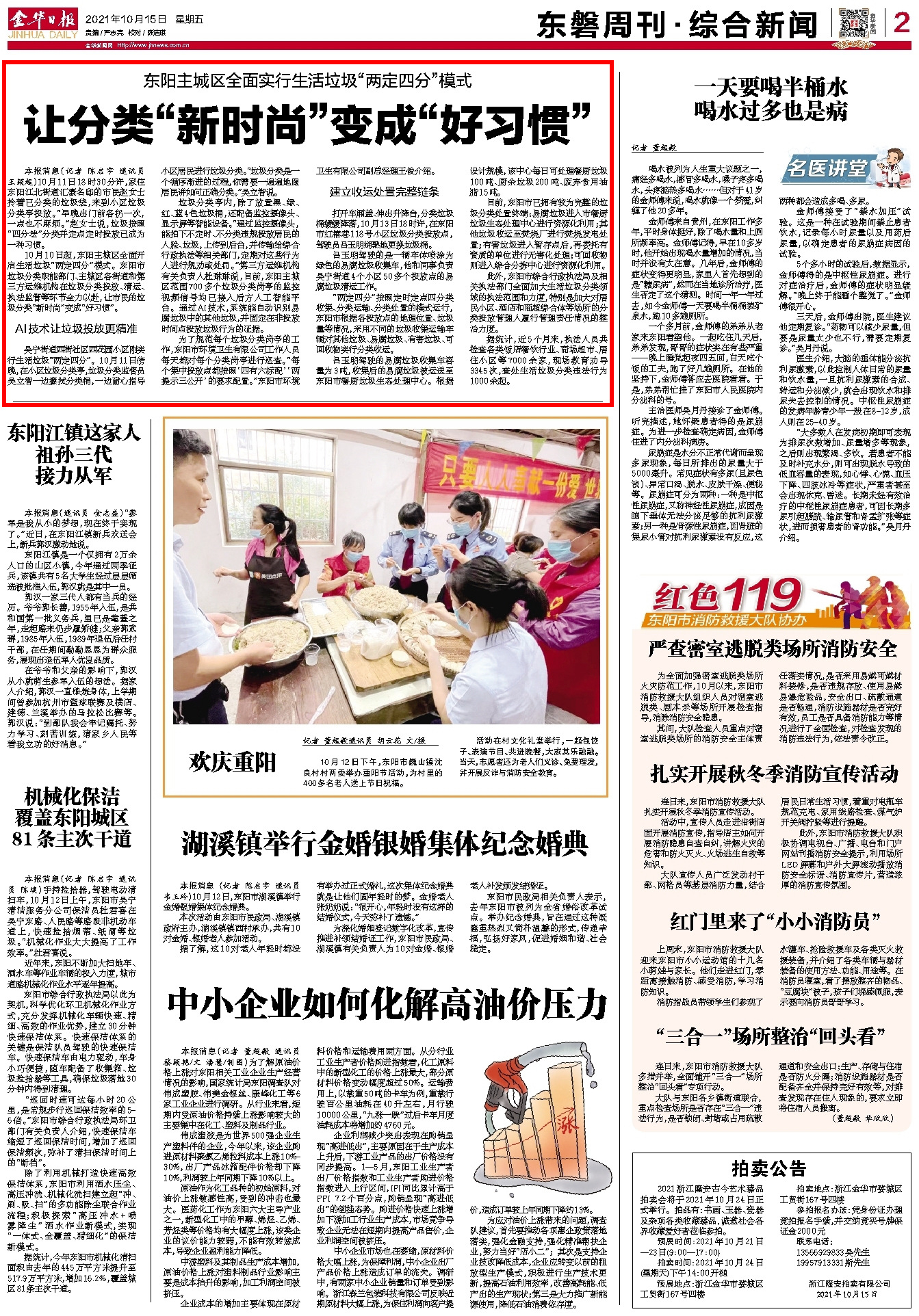 10月10日起,东阳主城区全面开启生活垃圾“两定四分”模式。东阳市垃圾分类职能部门、主城区各街道和第三方运维机构在垃圾分类投放、清运、执法监管等环节全力以赴,让市民的垃圾分类“新时尚”变成“好习惯”。