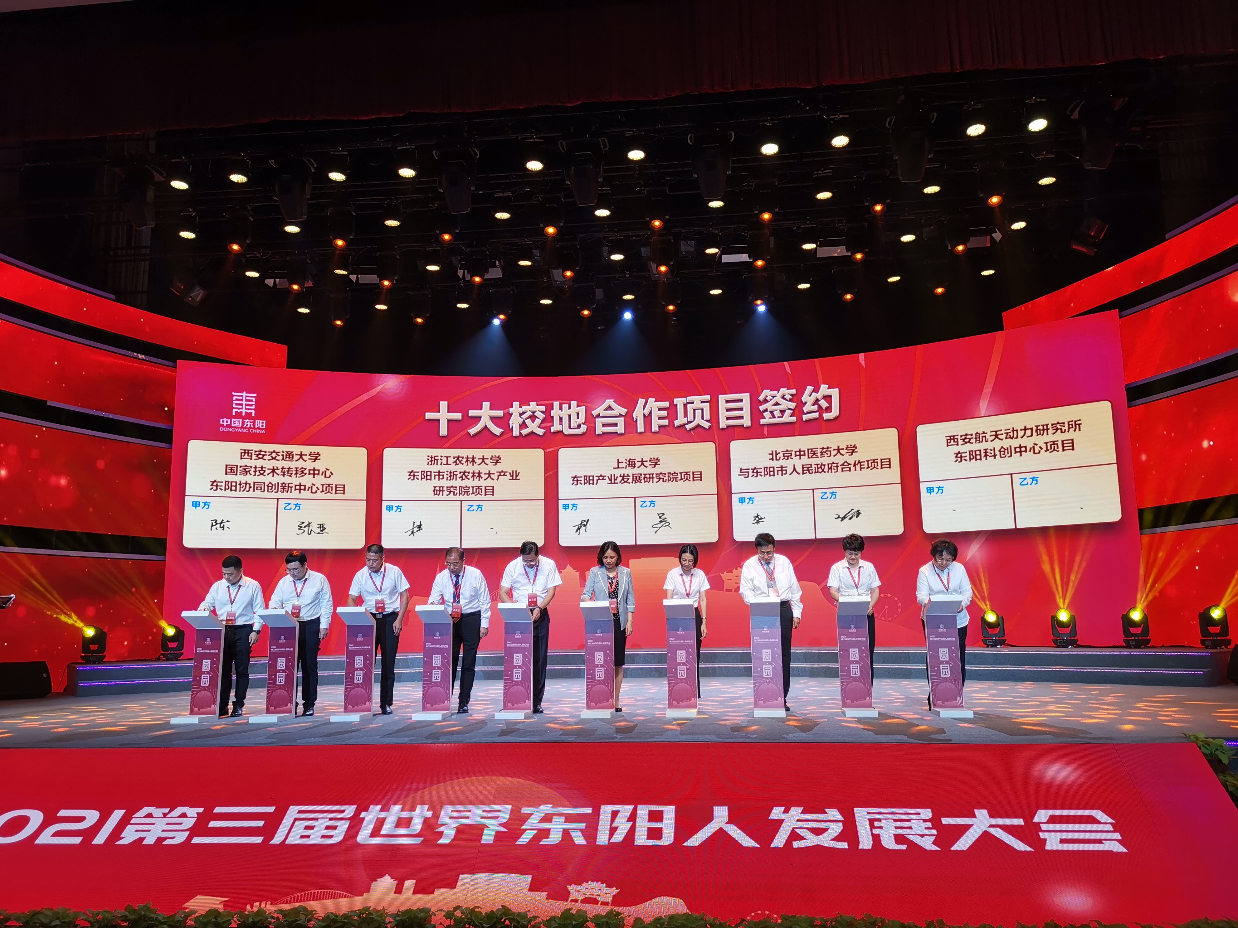在2021第三届世界东阳人发展大会上,总投资额约300亿元的“十大东阳人回归项目”集中签约。同时,大会现场还举行“十大校地合作项目”“十大科技成果转化项目”签约仪式。这些项目为东阳发展注入全新动能。