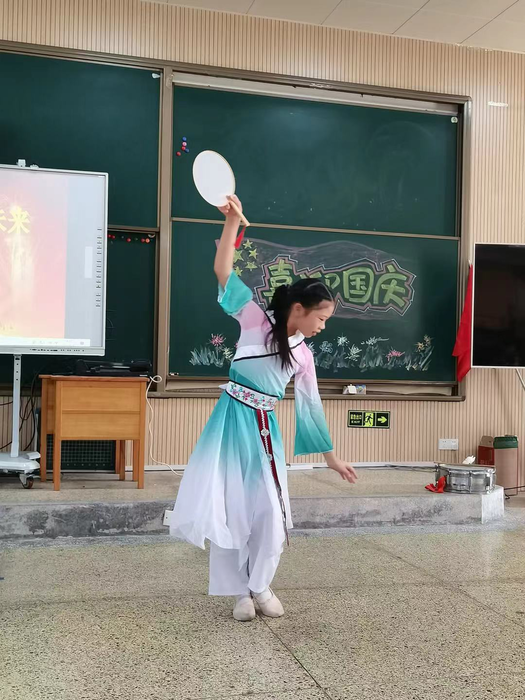 为营造国庆喜庆氛围,少先队员们进行了庆祝国庆的文艺汇演。大家通过前期的精心排练,用一个个精彩的节目,表达对祖国母亲的祝福。五(1)中队全体少先队员带来《名字叫中国》的手势舞,道出了对祖国的热爱;醉蝶独舞《桃源仙》中,表演者以优美的舞蹈展现了少先队员的拳拳爱国心;诗朗诵《少年中国说》,更是激励着现场每一名少先队员的报国雄心。