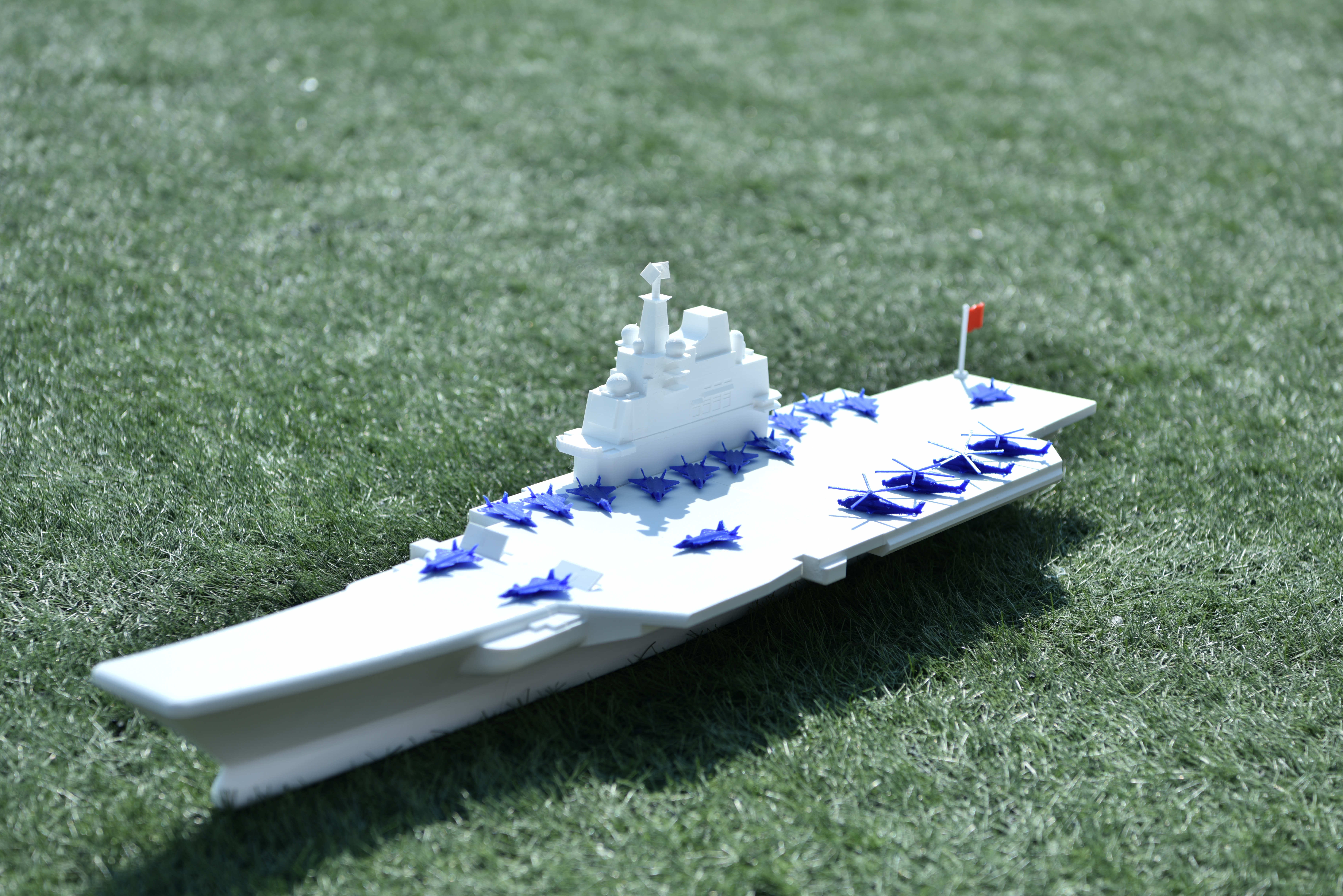 喜欢研究制作各种道具模型的学生朱振华说,接到老师建造“航母”的任务后,他通过网络平台上的辽宁舰的视频以及照片,用3D建模软件画出了舰体以及舰载机、武装直升机的设计图。随后1个多月时间内,同学们通过3D打印设备一步步打印成型,最终完成了这艘航母模型的建造。