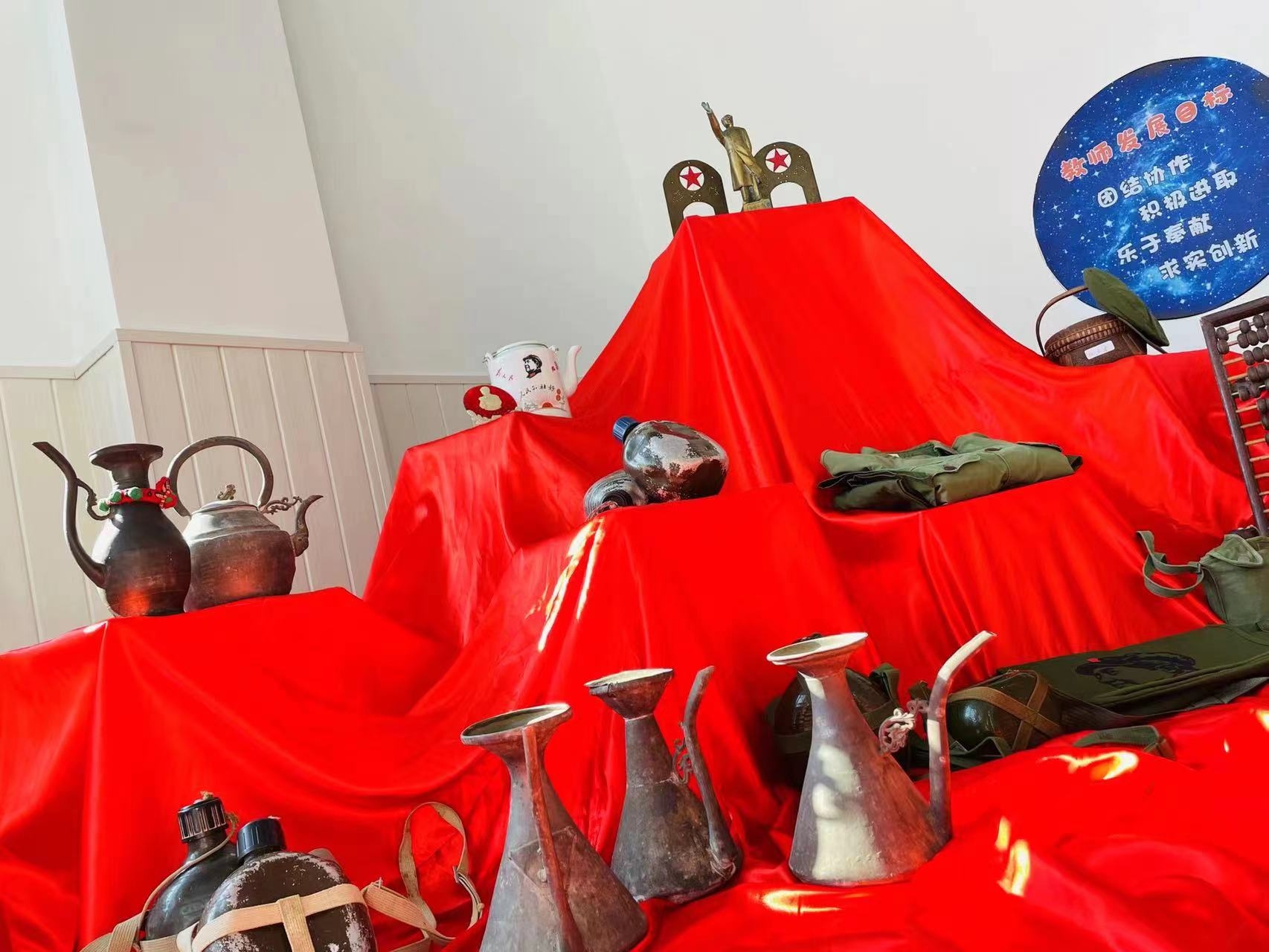 近几天,孩子们在家长帮助下,收集到各种老水壶、旧军服、毛主席像等红色老物件。