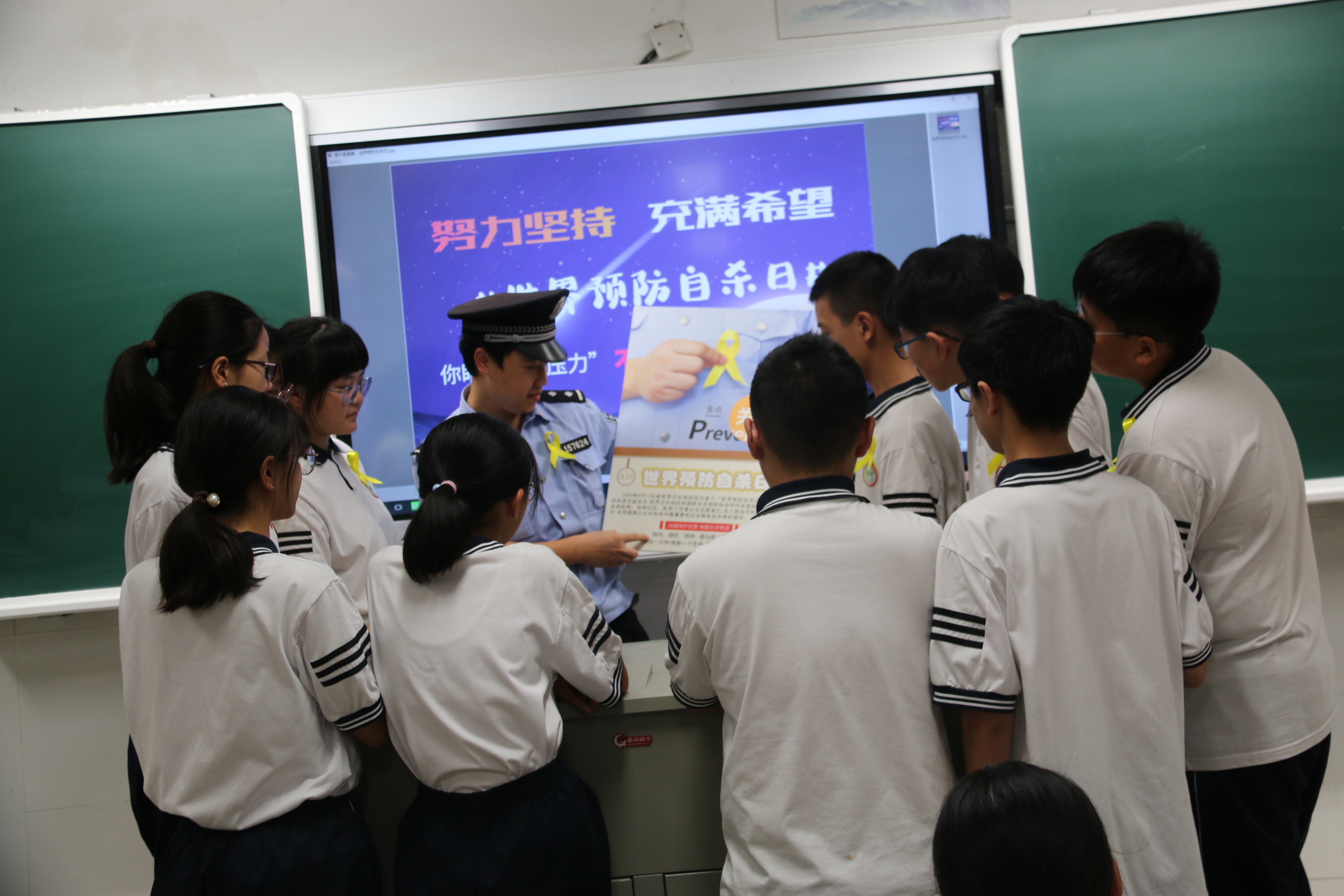 宣教警察虞建坤在804班教室作现场报告,全校学生在各自教室内观看钉钉直播。虞建坤通过具体案例,介绍了性侵、校园欺凌、电信诈骗、毒品、邪教等违法行为以及相应的预防措施。他还介绍了9月10日世界预防自杀日的相关知识,并给学生代表佩戴了寓意平安的黄丝带,提醒同学们珍爱生命,学会正确排除不良情绪,勇敢面对生活中的困难和挫折,养成积极乐观的人生态度。