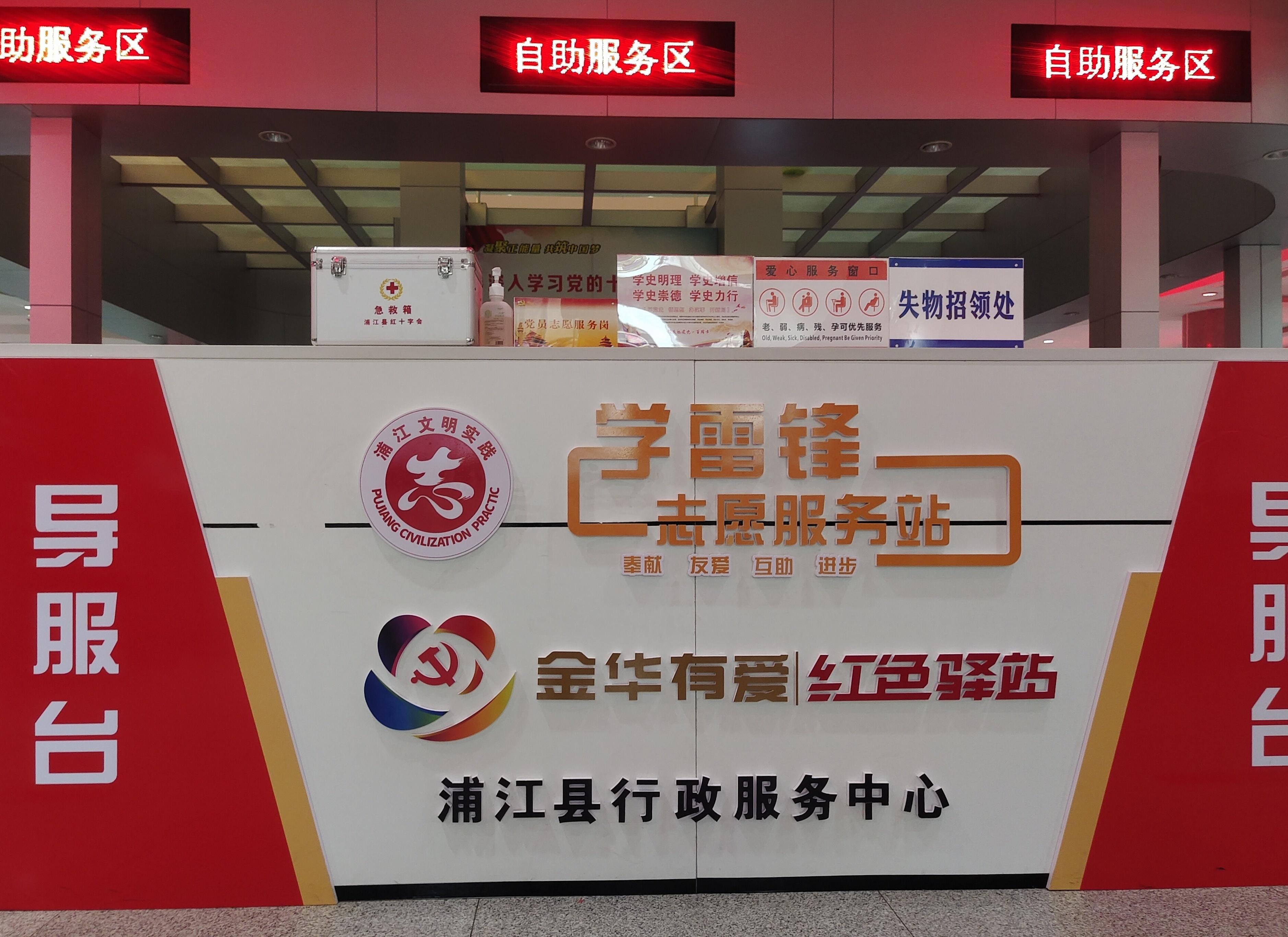在浦江县360便民行政服务中心大厅的导服台,“红色驿站”标识十分醒目,向前来办事的群众及户外工作者统一提供咨询引导、茶水、充电等服务,并设置自助服务区,内有图书卡座,方便过往群众暂时歇脚。
