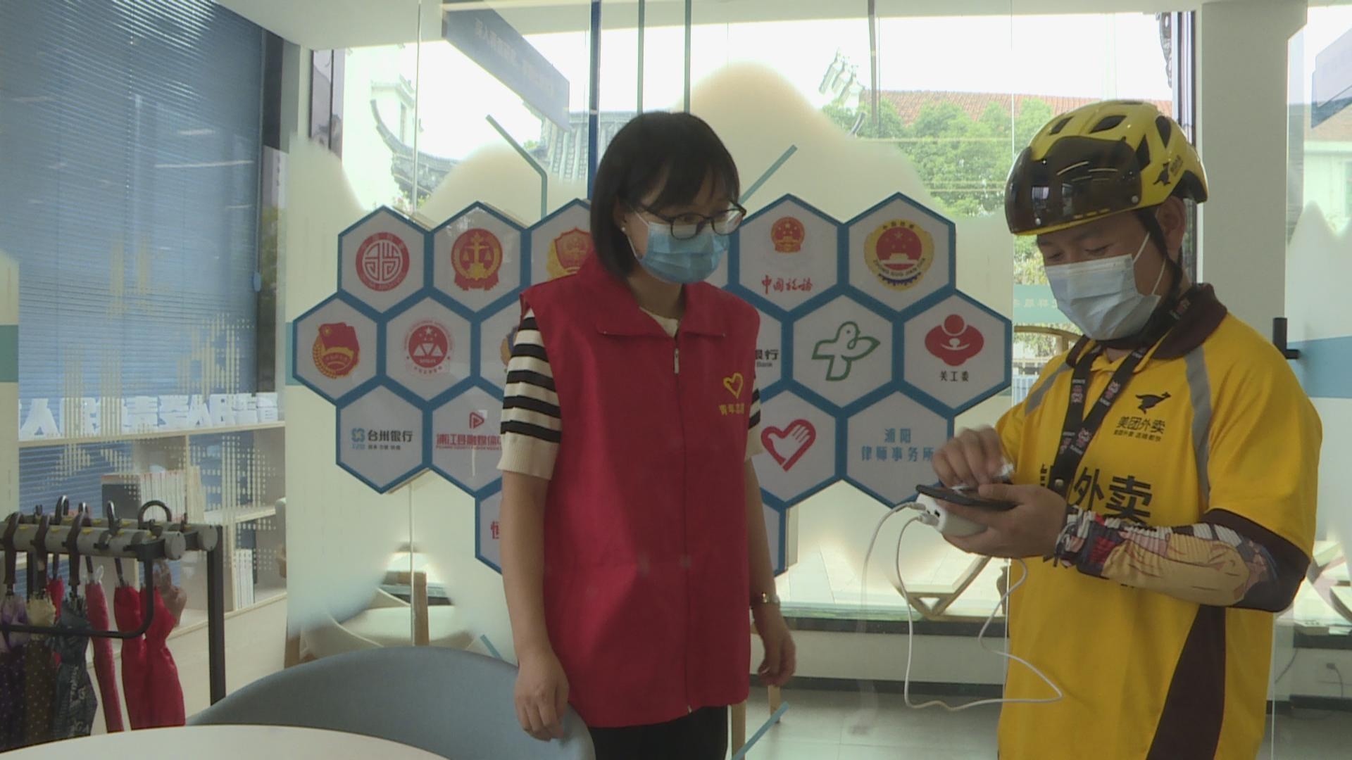 在仙华街道中埂社区的“金华有爱•红色驿站”,工作人员为前来驿站求助的外卖小哥拿来充电宝,帮他充电联系上客户。