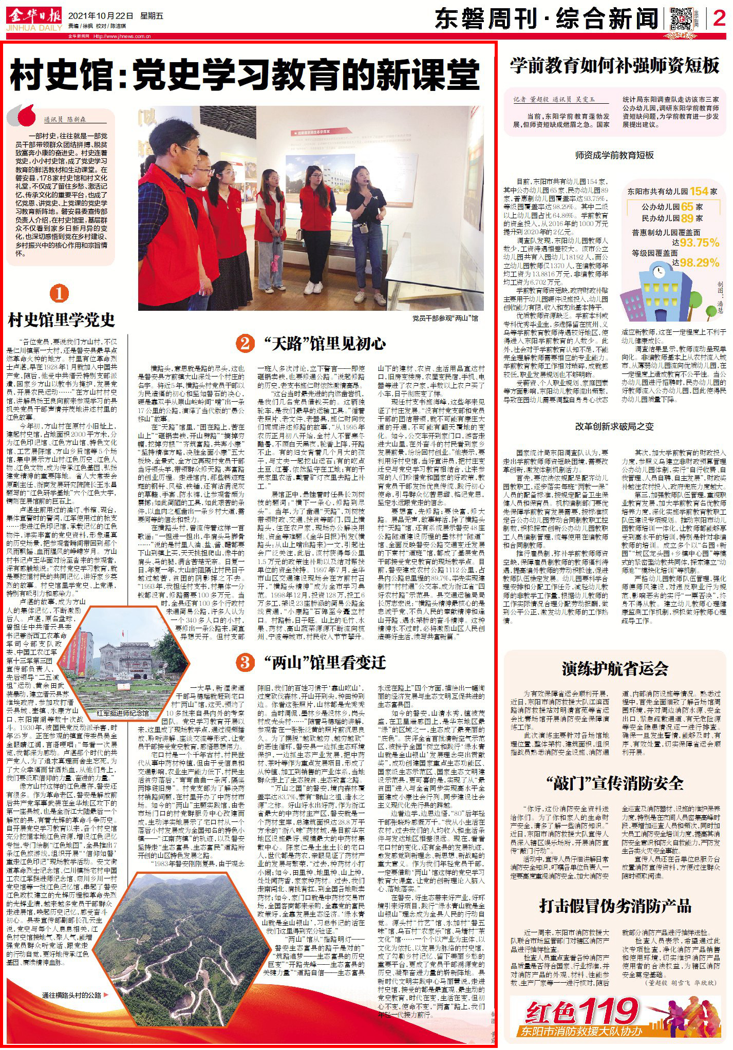 今年初,方山村在原村小旧址上,建起村史馆,占地面积2000平方米,分为红色印记馆、红色方山馆、特色文化馆、工艺展陈馆、方山乡贤馆等5个场馆,集中展示方山村红色历史、红色人物、红色文物,成为传承红色基因、弘扬建党精神的重要阵地。省人大常委会原副主任、浙商发展研究院院长王永昌题写的“红色研学基地”六个红色大字,镌刻在展馆前的巨石上。