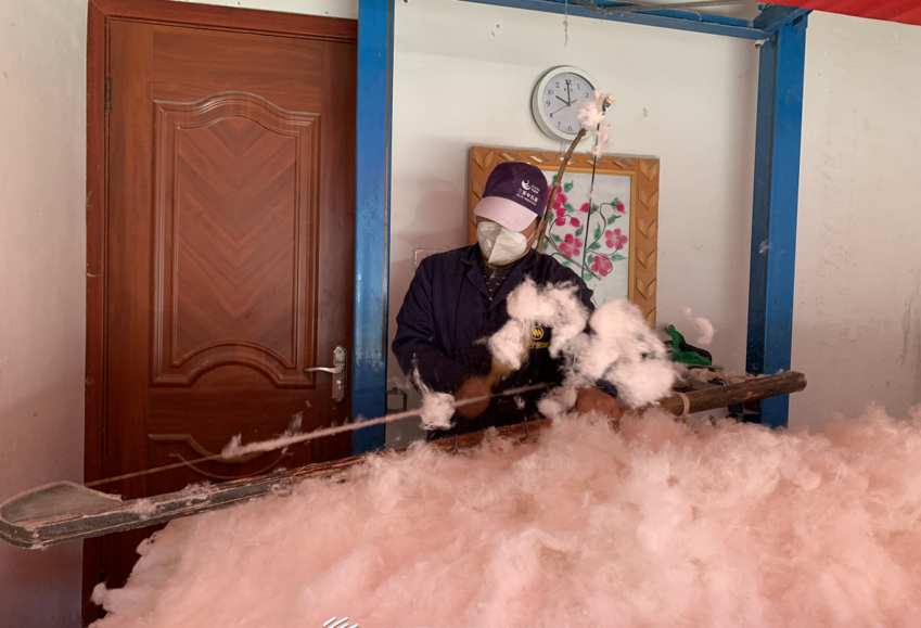 在兰溪市区一家棉胎加工店内,店主金师傅左手持弓,右手拿着弹花槌,灵活地捶打。厚实成团的棉花经过几番拨弹,变得轻柔蓬松。待棉花渐趋疏松,再用机器将棉花压平实。不一会儿,一床雪白的新棉被就做成了。