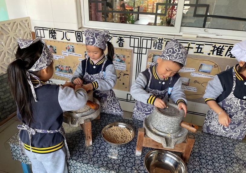 在兰溪市游埠中心幼儿园的手工作坊内,几名孩子戴着头巾,围着围裙,分工明确,有模有样地磨着游埠豆浆。依托游埠古镇文化,该幼儿园致力于打造具有游埠特色的户外活动场地和室内环境,创设古镇特色品牌课程,让孩子真正享受到“家门口”的特色优质教育资源。“我们以和而不同、乐润成长为办学理念,通过挖掘古镇资源,开设古镇特色课程,将爱党、爱国、爱乡的思政教育融入幼儿主题课程活动中,培育全面发展的和乐儿童,创一流的优质教育和乐幼儿园。”该幼儿园园长管晓明介绍。