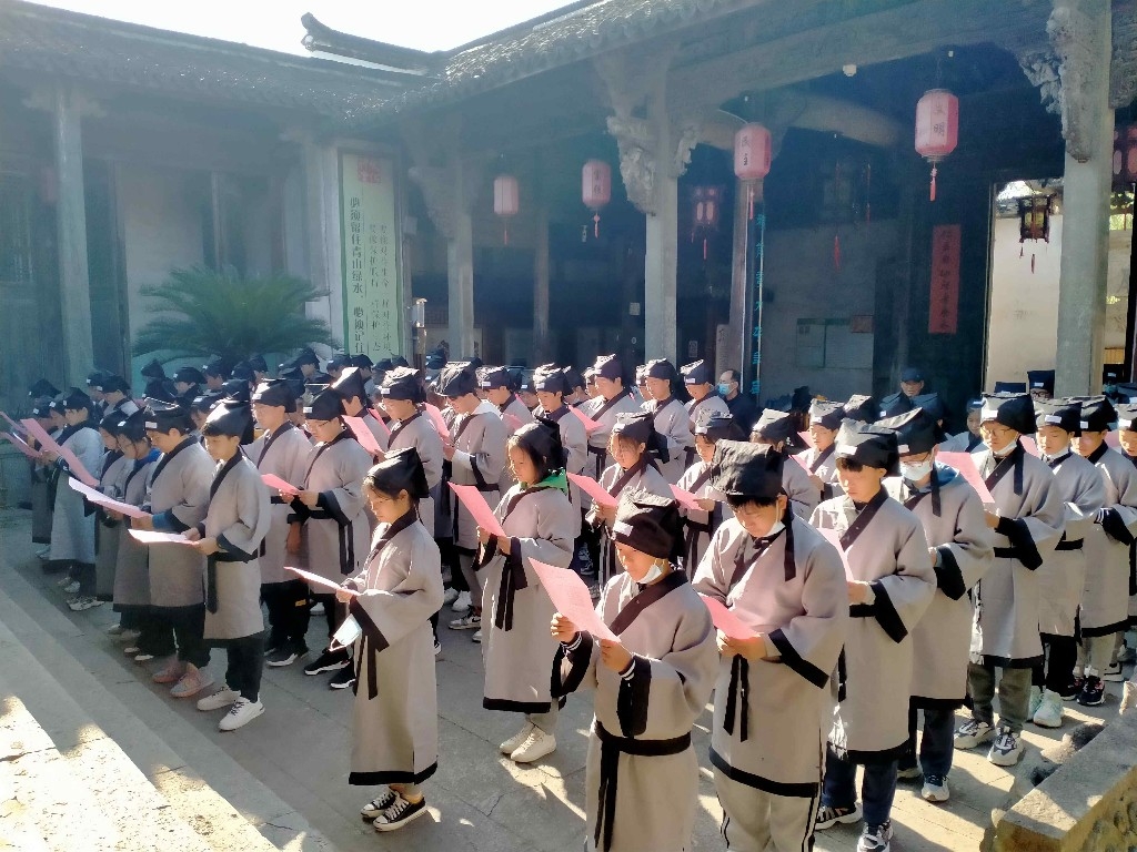 在国保单位“余庆堂”和省保单位“章氏家庙”古色古香的建筑中来一场研学活动、来一场寻宝游戏是一种什么样的穿越体验?在兰溪市女埠街道千年古村落渡渎,经常可以看到学生们身着古代“青衿”学生服、头戴方巾、手持毛笔伏案书写,在青砖黛瓦下、小街巷弄中嬉笑奔跑做着各种各样的拓展游戏,沉浸式体验古代儒生的学习生活,切身感受理学之乡的文化底蕴。
