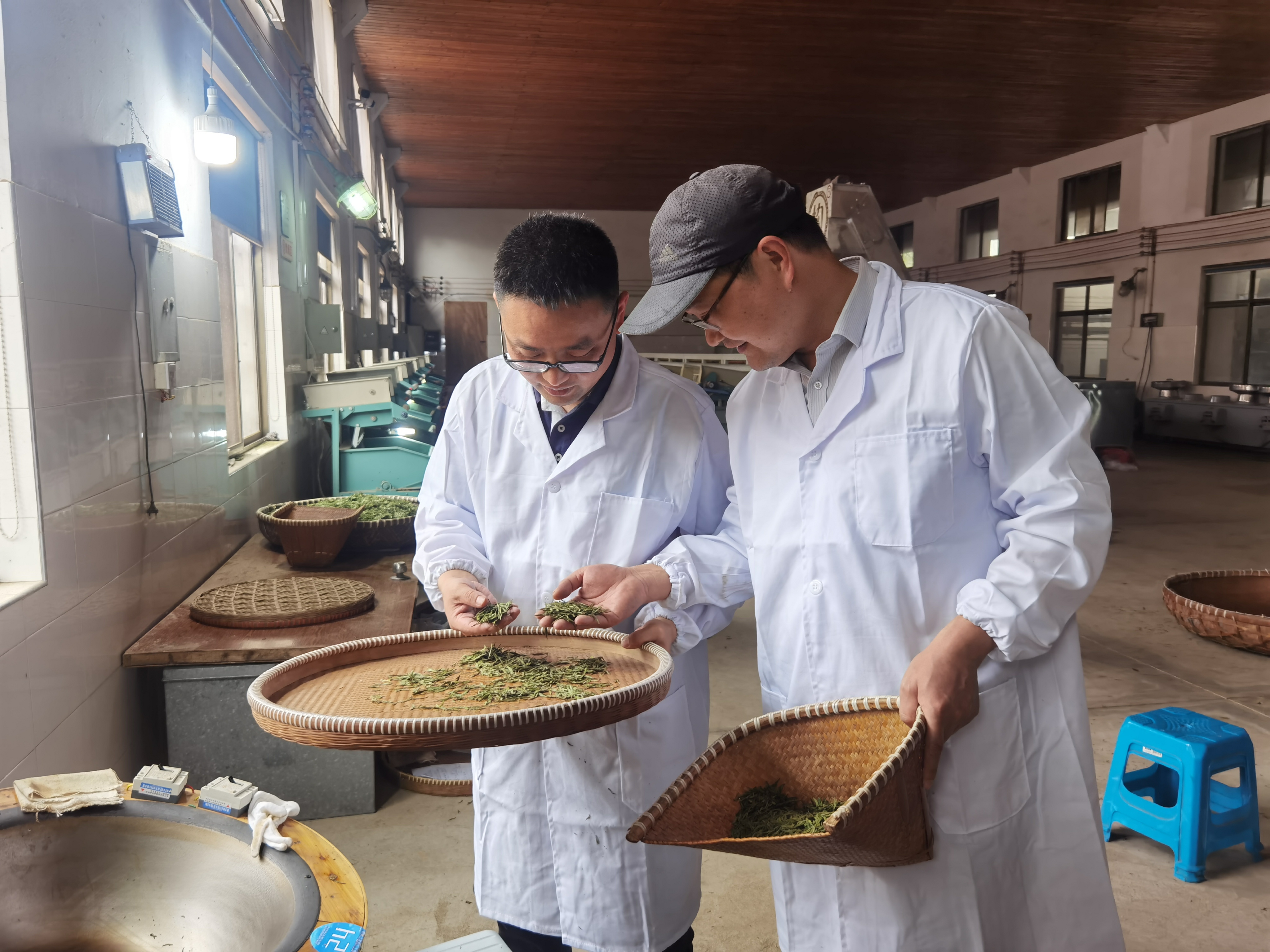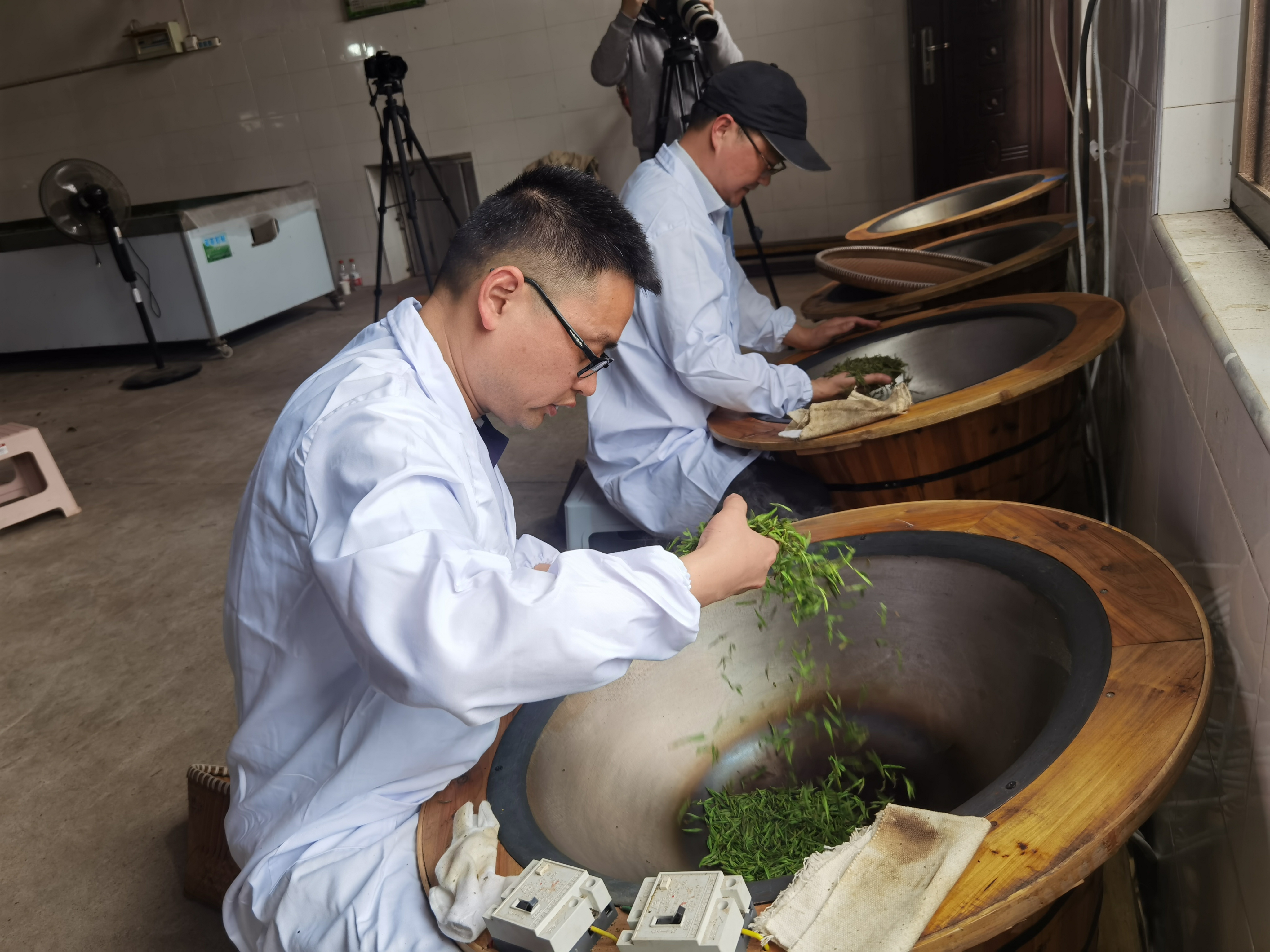 在白龙山茶场,几位炒茶师傅为金华的名优茶“箬阳龙珍”制作了参考样。手工制茶的样本,由第五届全国茶业职业技能竞赛绿茶加工冠军徐杰,以及浙江工匠、高级农艺师茹利军制作。机器制茶的样本,则由金华本地的婺江丝雨茶业合作社有30多年制茶经验的方兆有制作。他们调整了各项技术参数,目的是改进工艺,提升品质。