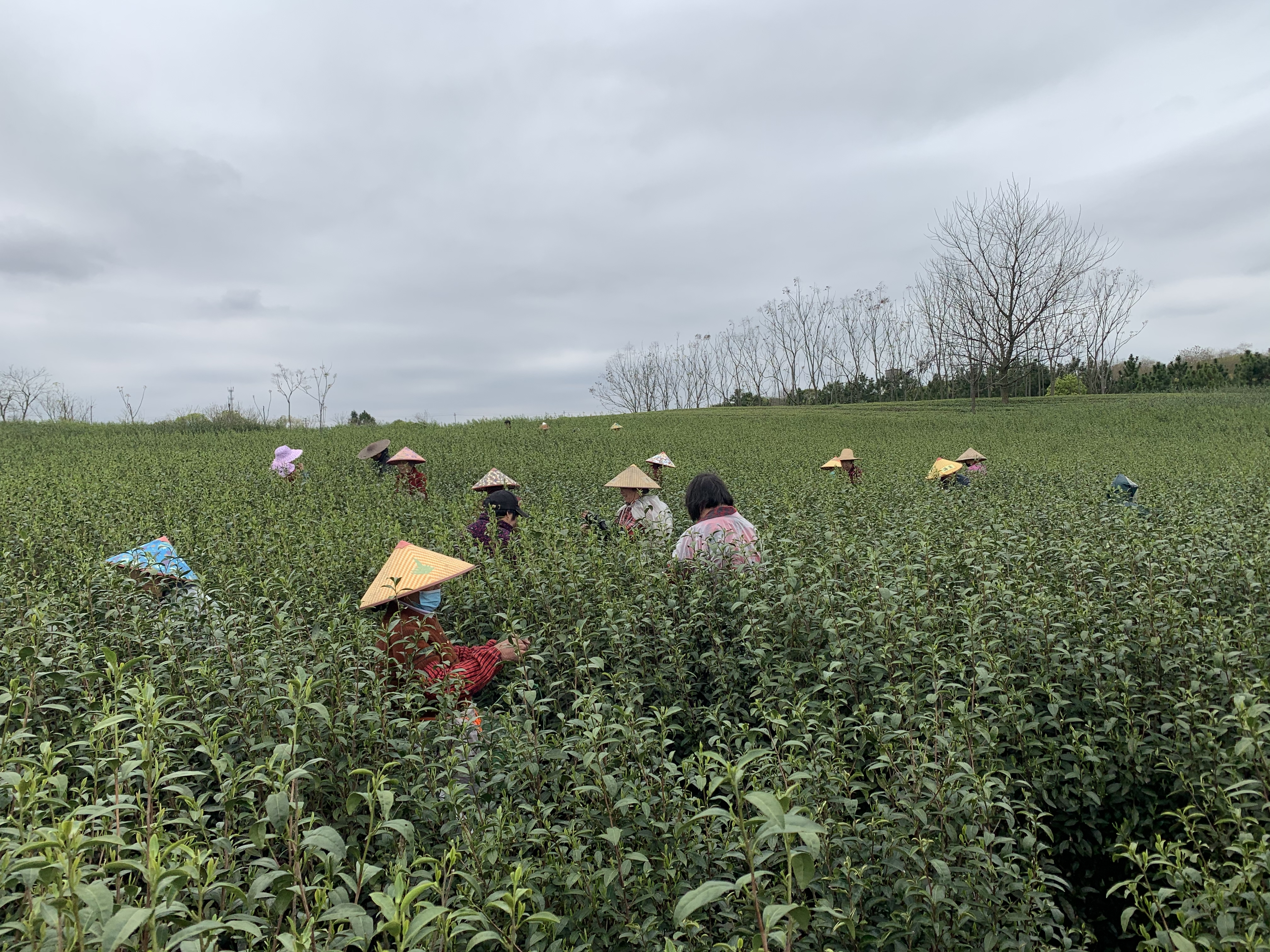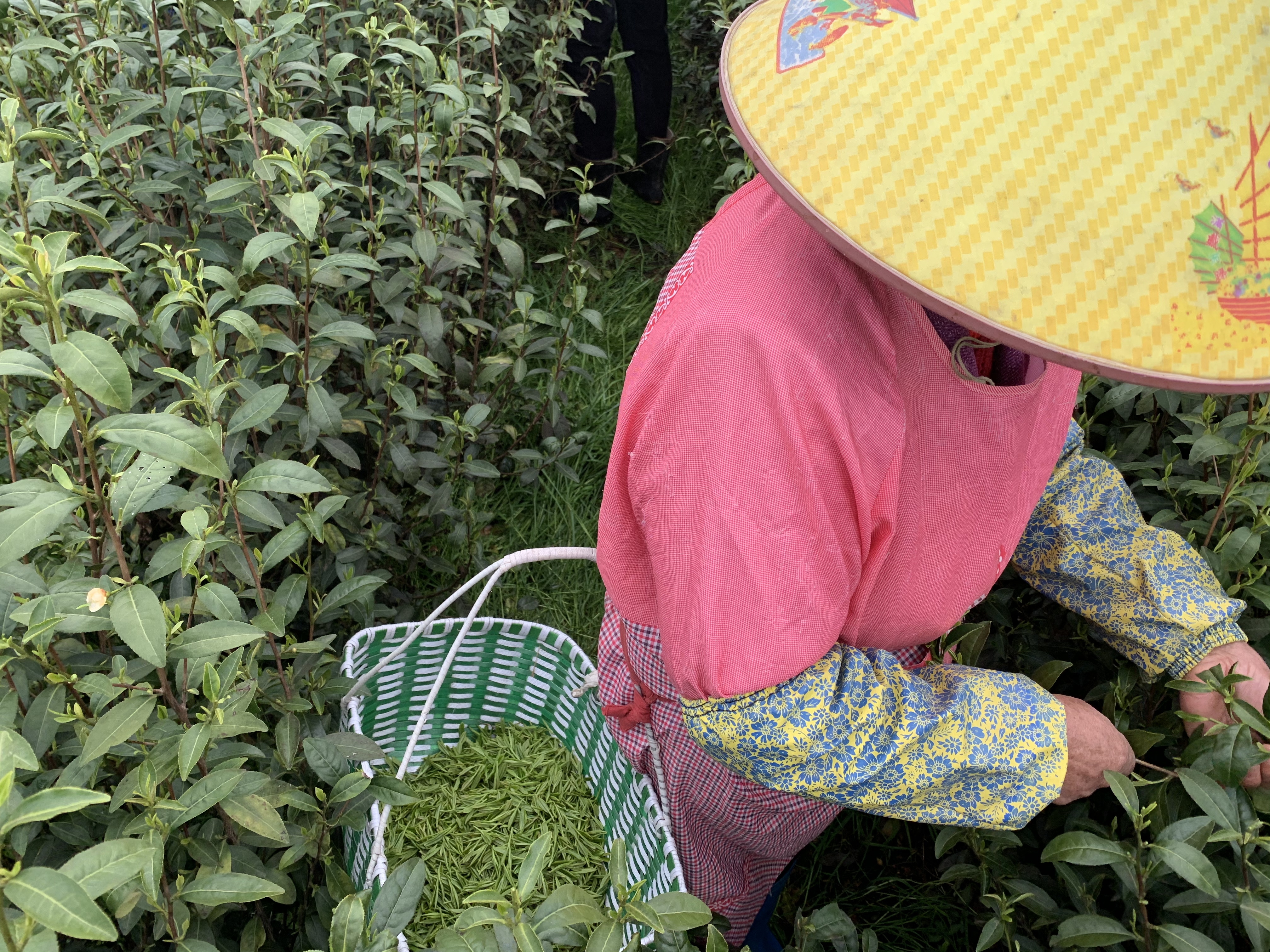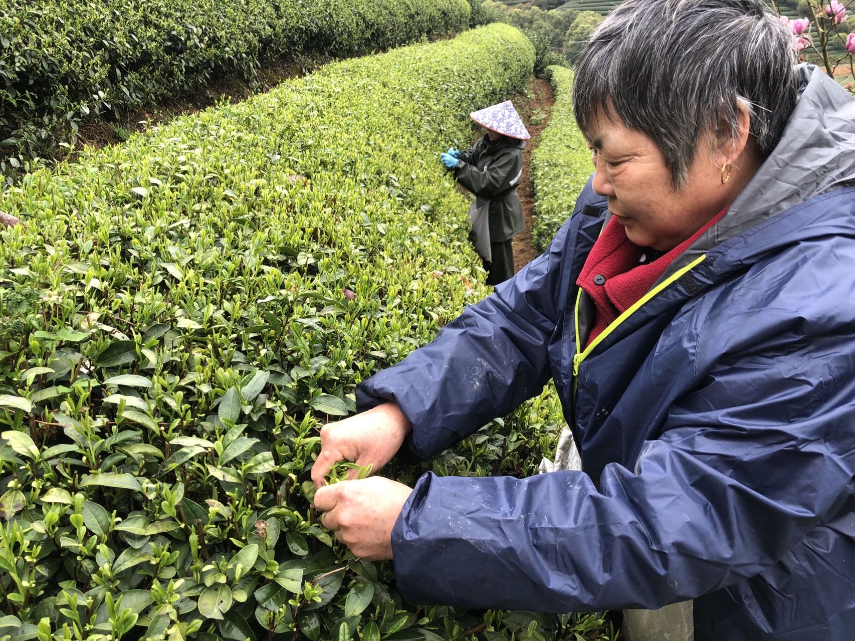 这一批是最好的茶叶,全部需要人工采摘。之前气温上升得很快,茶叶长得太快,来不及采摘,因此像吕兰香这样的采茶工还是很抢手的,经营主也在想办法多招人。根据天气情况,每天过来的采茶工数量不等,有时三四十人,有时七八十人。
