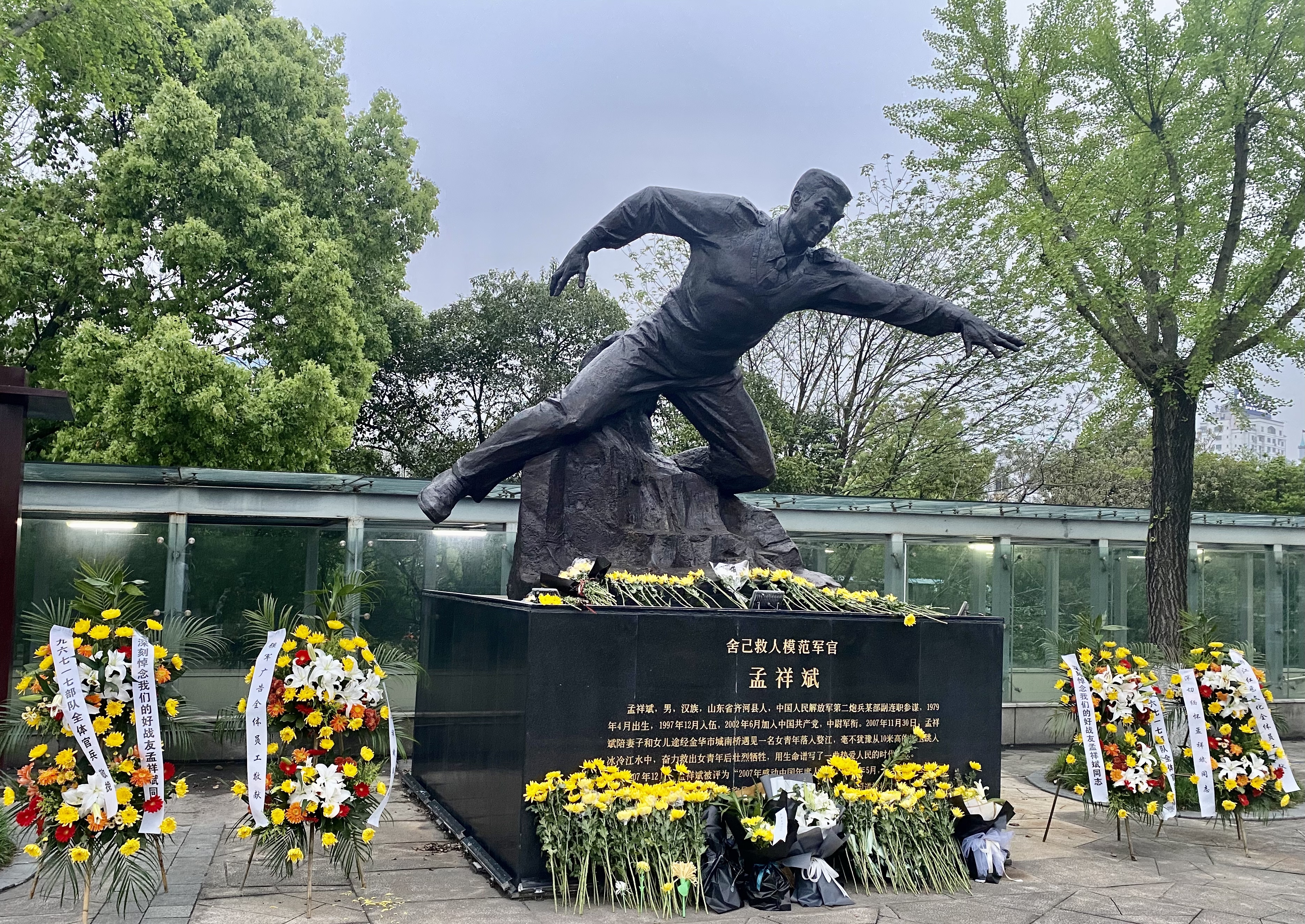 一个人感动一座城。每逢清明时节,部队官兵,单位员工和学校师生及金华市民来到市区城南桥头的孟祥斌烈士雕像前送上一束鲜花缅怀英雄壮举,十五年来从未间断。
