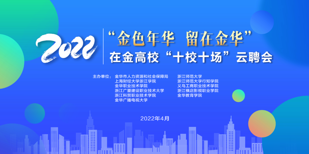 据了解,活动时间4月11日—5月30日,活动主题为“金色年华 留在金华”,线上开展“十校十场”云聘会。其中,用人单位报名为4月11日-18日;简历投递及面试时间为4月18日-5月30日。