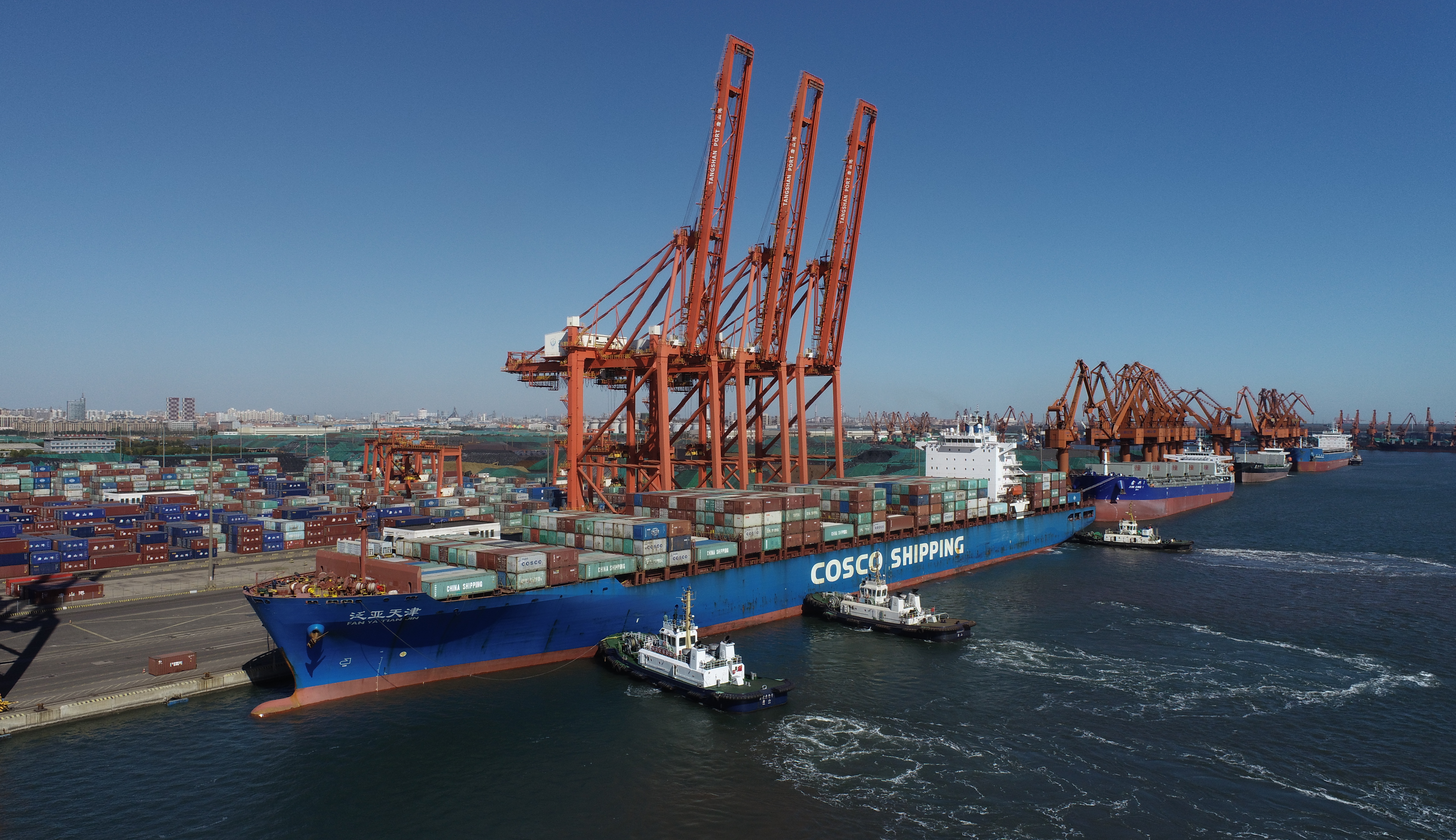 一艘轮船在拖轮的协助下向唐山港京唐港区集装箱码头靠泊(2021年10月23日摄,无人机照片)。新华社记者 朱旭东 摄