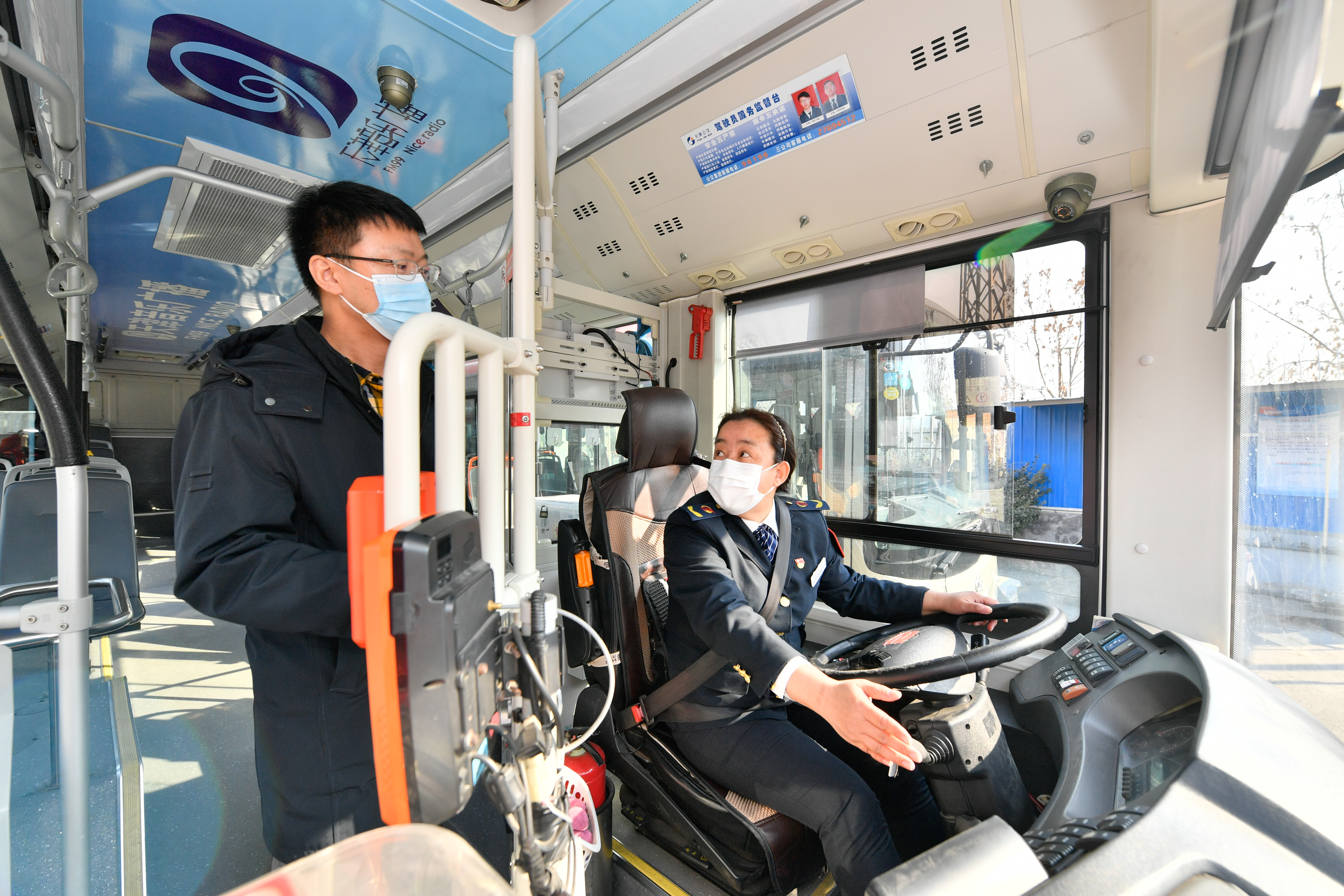 全国人大代表、天津市公交集团第三客运有限公司8路车队驾驶员王艳(右)与徒弟刘彬交流(2月24日摄)。新华社记者 孙凡越 摄