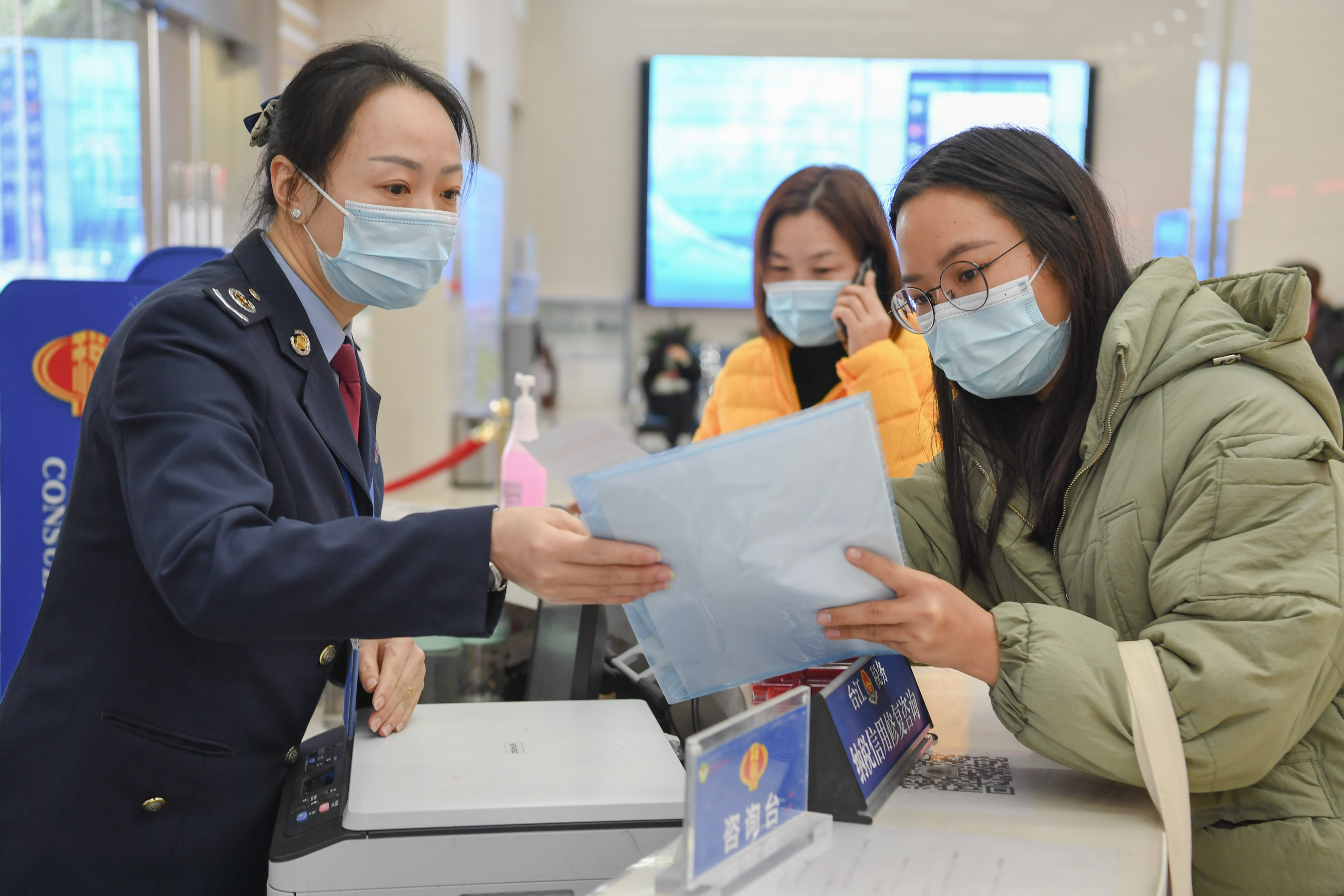 在国家税务总局福州市台江区税务局办税服务厅,纳税人在纳税信用修复咨询窗口咨询涉税业务(2021年1月15日摄)。新华社记者 宋为伟 摄