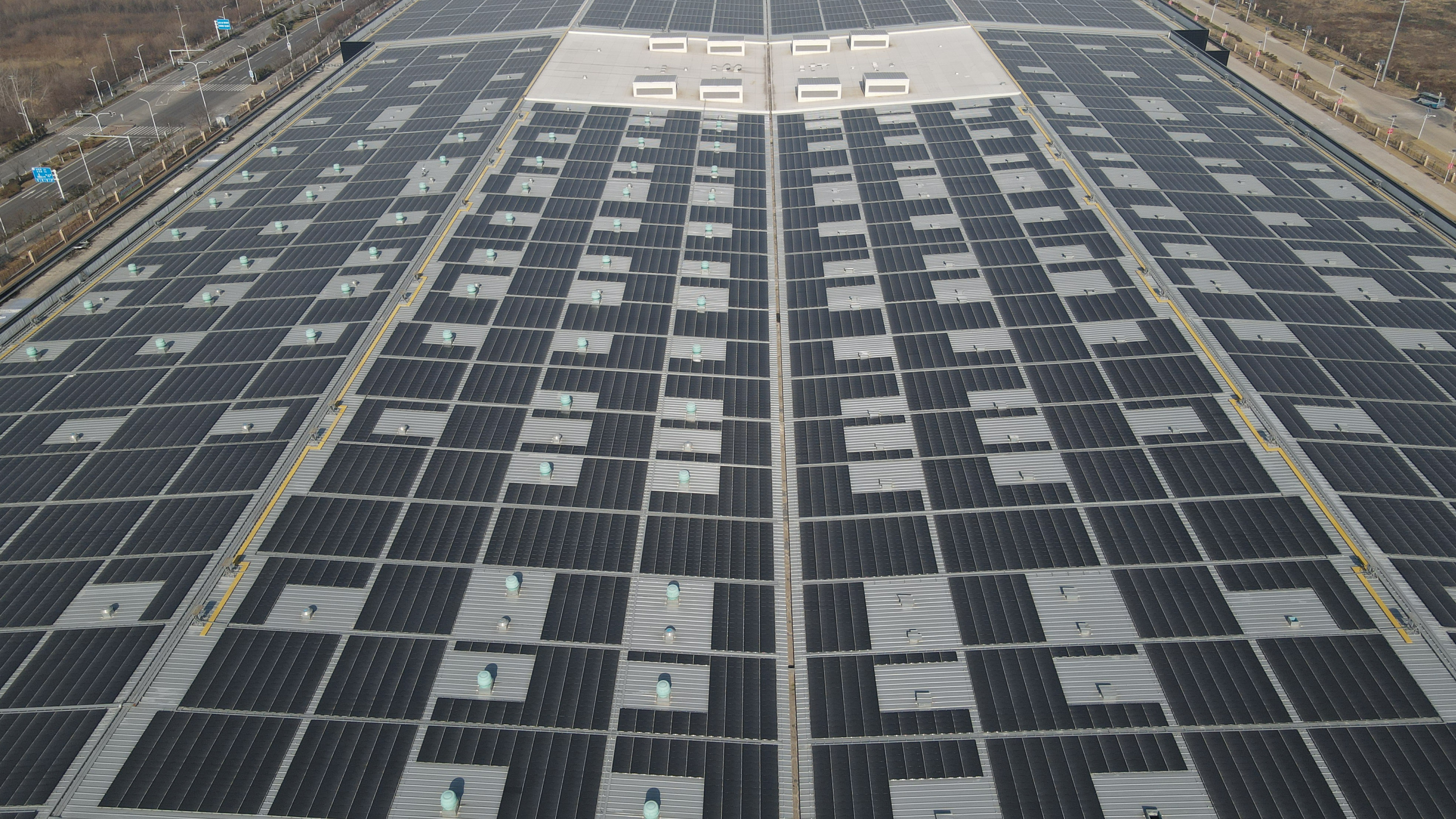 这是位于蚌埠中光电科技有限公司内的薄膜光伏建筑一体化应用示范项目(2021年12月21日摄,无人机照片)。新华社记者 张端 摄