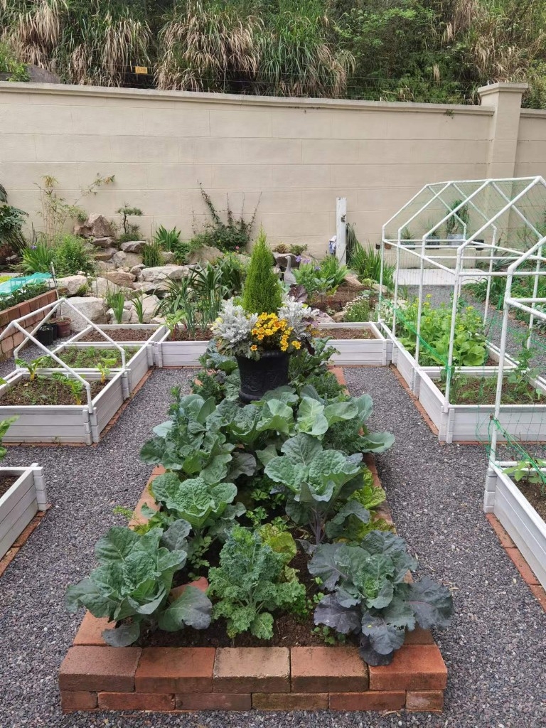 种菜虫子多怎么办?在做花园前,他们先铺上防草布,再铺上小石子,这样地上就不容易长草。蜗牛、鼻涕虫这一类的软体小动物也基本没有了。他们选择实木的组合花坛,抬高了菜地,这样既漂亮,又干净,不仅虫子少,蔬菜的光照也更多。