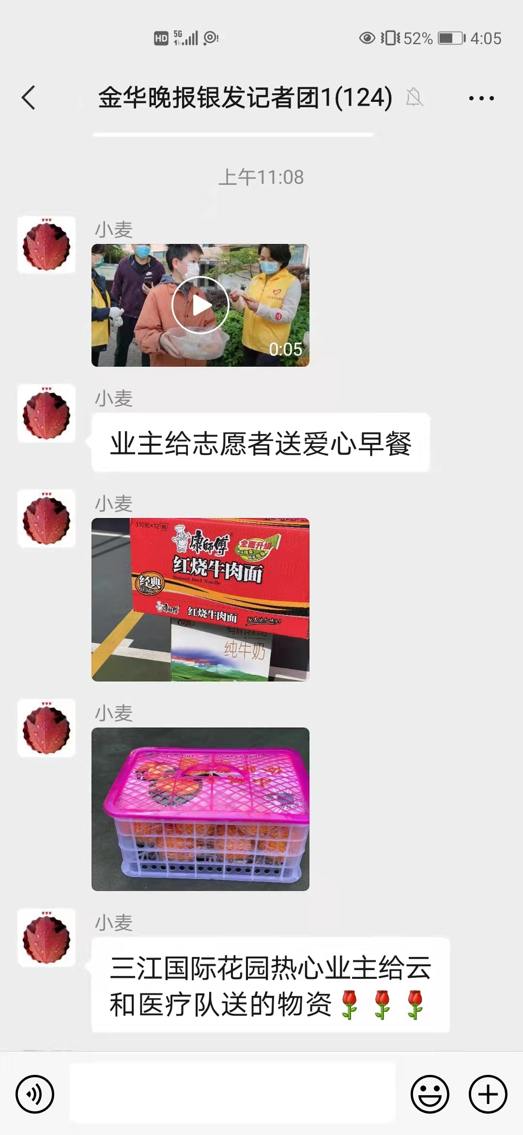 据了解,“小麦”住在市区三江国际花园。近日,小区开展多轮核酸检测,大白和志愿者都非常辛苦。业主很感谢他们,总想表达一二。送物资的业主说,这是她的小小心意,希望云和医疗队能在这里感受到被尊重、被温暖。据了解,她自己也是一名志愿者,“力所能及的事情,我们应该去做”。