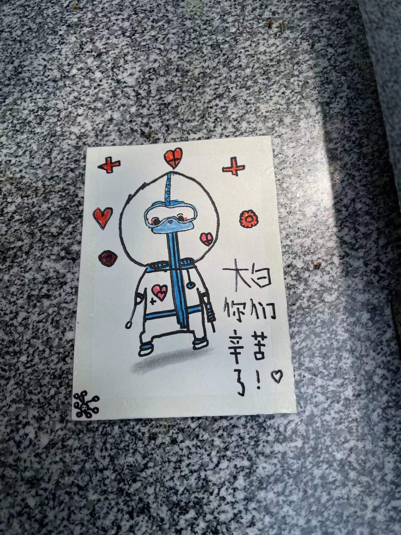 在市区新世纪花园的核酸检测采样点,也有类似的场景。昨天,业主钱丽君给大白送来水果。她说:“我也是医生,也要出任务。为了早日恢复正常生活,大家都辛苦了。”今天,一个孩子给大白送来治愈系的图画。小小的举动,传递着温暖。