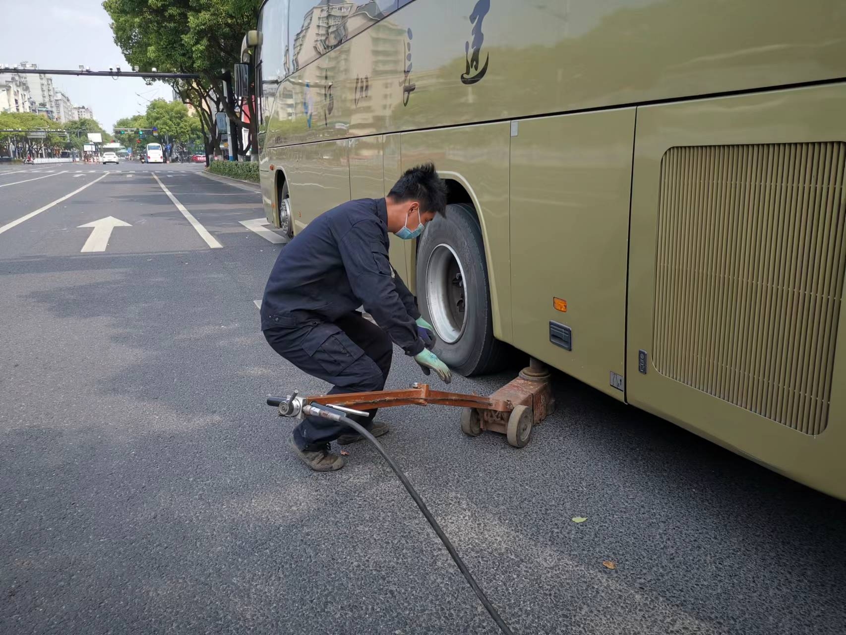 20日上午10时左右,一辆浙H开头的大巴停在宾虹路上,等待维修。倪先生赶到现场,经过初步检查,发现该车左后侧两只轮胎都漏气,无法再上路行驶,需要维修车前来施救。挞夫汽服位于疫情管控区,倪先生立即申请临时通行证。下午1时多,维修车辆抵达,对损坏的轮胎拆卸后进行了修补,用时一个半小时左右,未收任何费用。