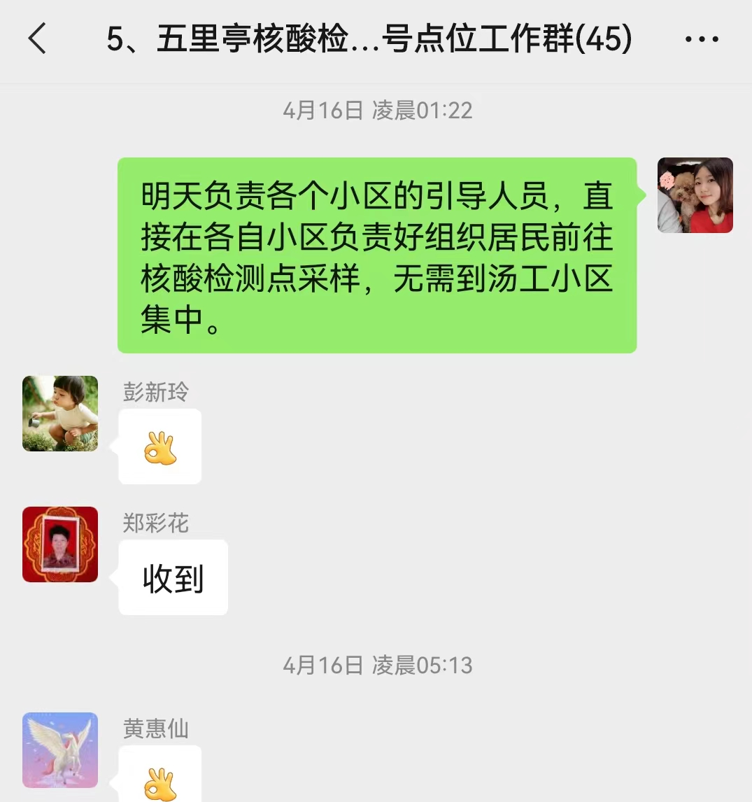 “年纪这么大了,让我们很感动。”陈露告诉记者,这几天社区关于第二天核酸检测的工作信息要半夜一两点才下发,不管多晚,郑奶奶都等在手机旁,通知刚下发,她准会立马回信息。陈露特意给记者看了一段聊天记录,4月16日1:22分,她刚在社区核酸检测点位工作群发了一条通知,郑奶奶秒回“收到”。“她说,时不时要看下手机的,真的很有心!”陈露说。