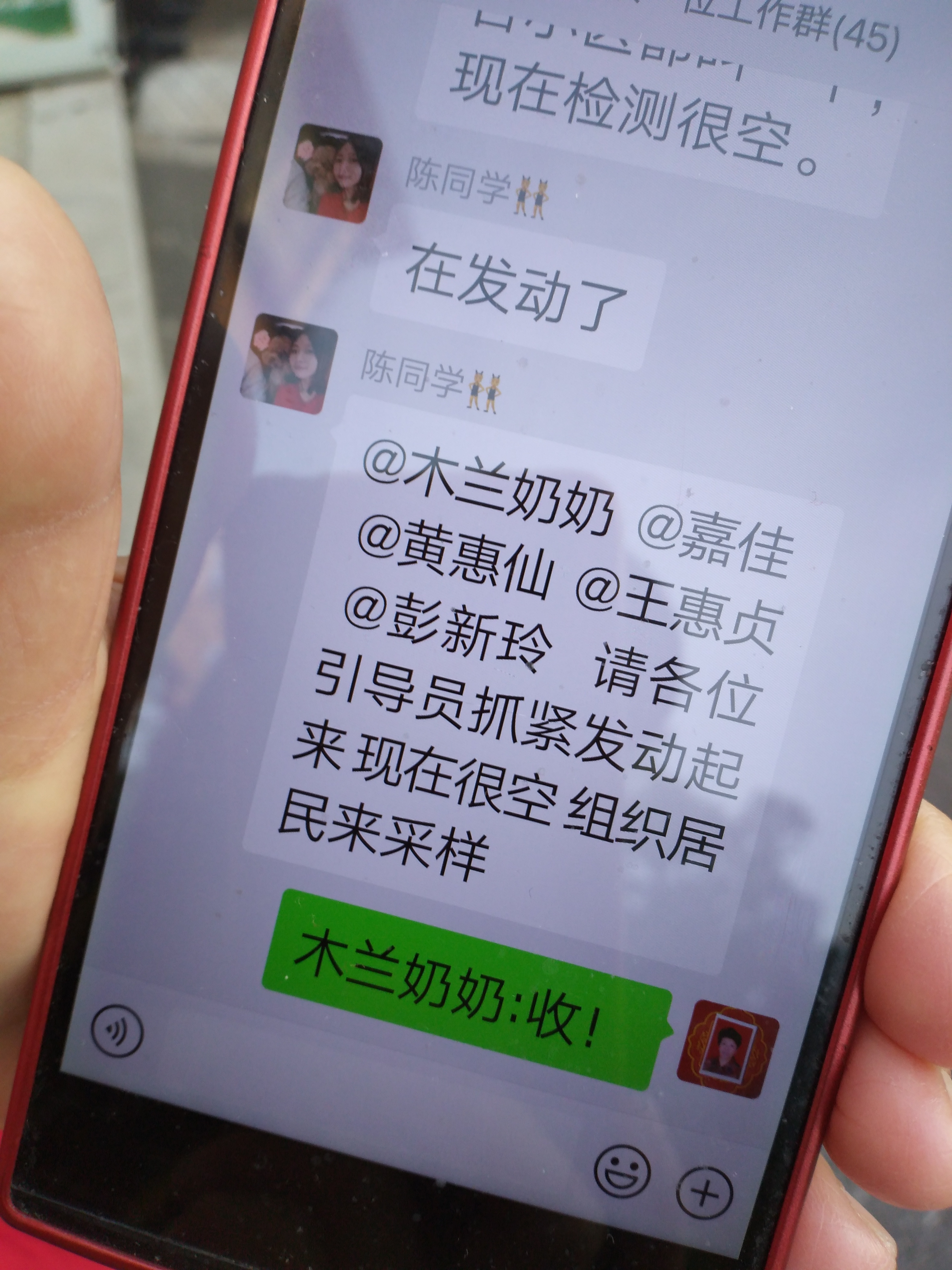 “请各位引导员抓紧发动起来,现在很空,组织居民来采样。”6:33分,采访快结束时,郑彩花又收到了社区通知,她秒回:“木兰奶奶,收!”