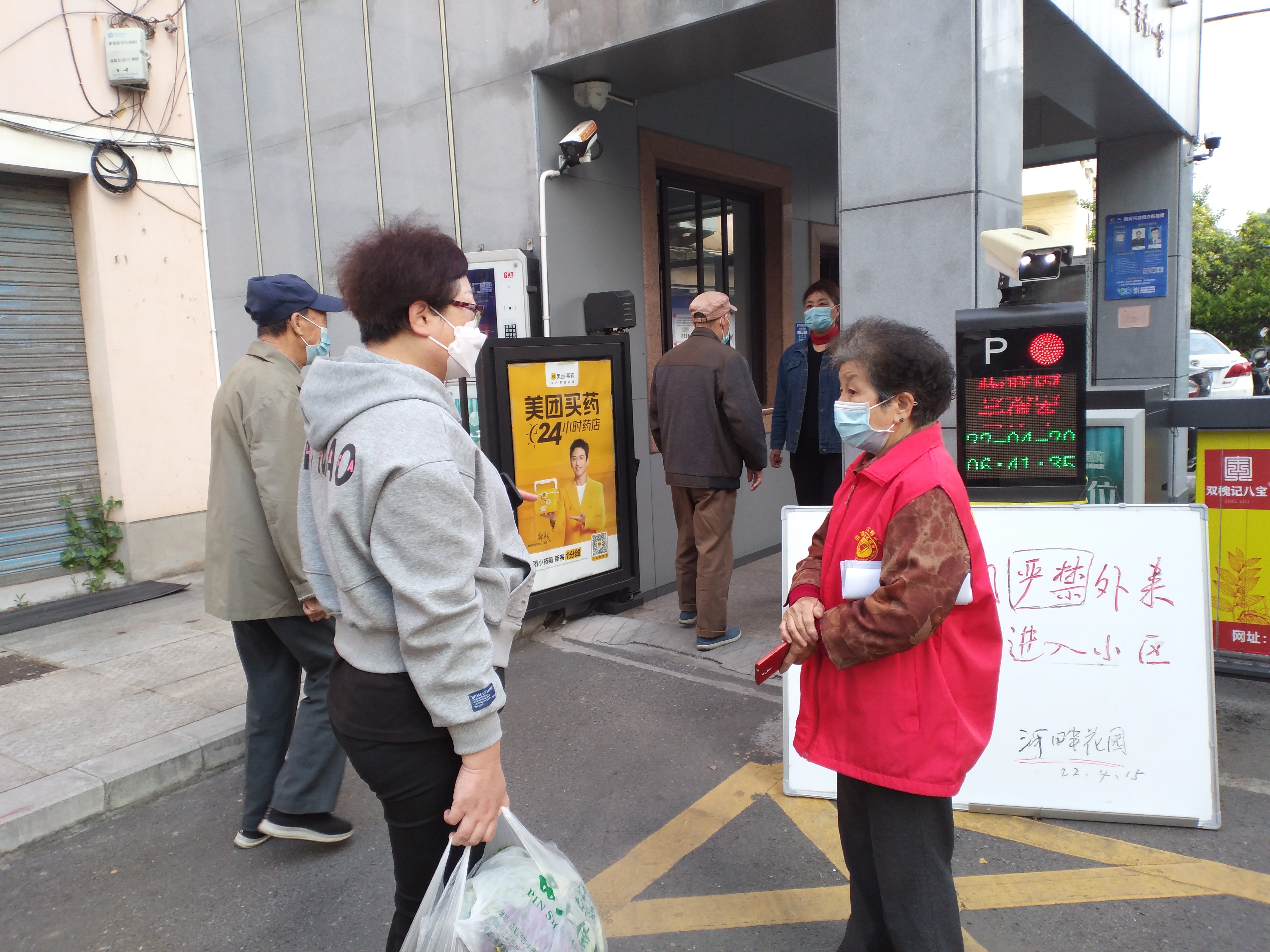 20日早上6点许,记者来到河畔花园小区门口时,一位穿着红马甲的老人,立马叫记者扫金华防疫码。她就是郑彩花,当时她一边等居民下楼做核酸,一边和业委会商量小区两名红码人员的事。