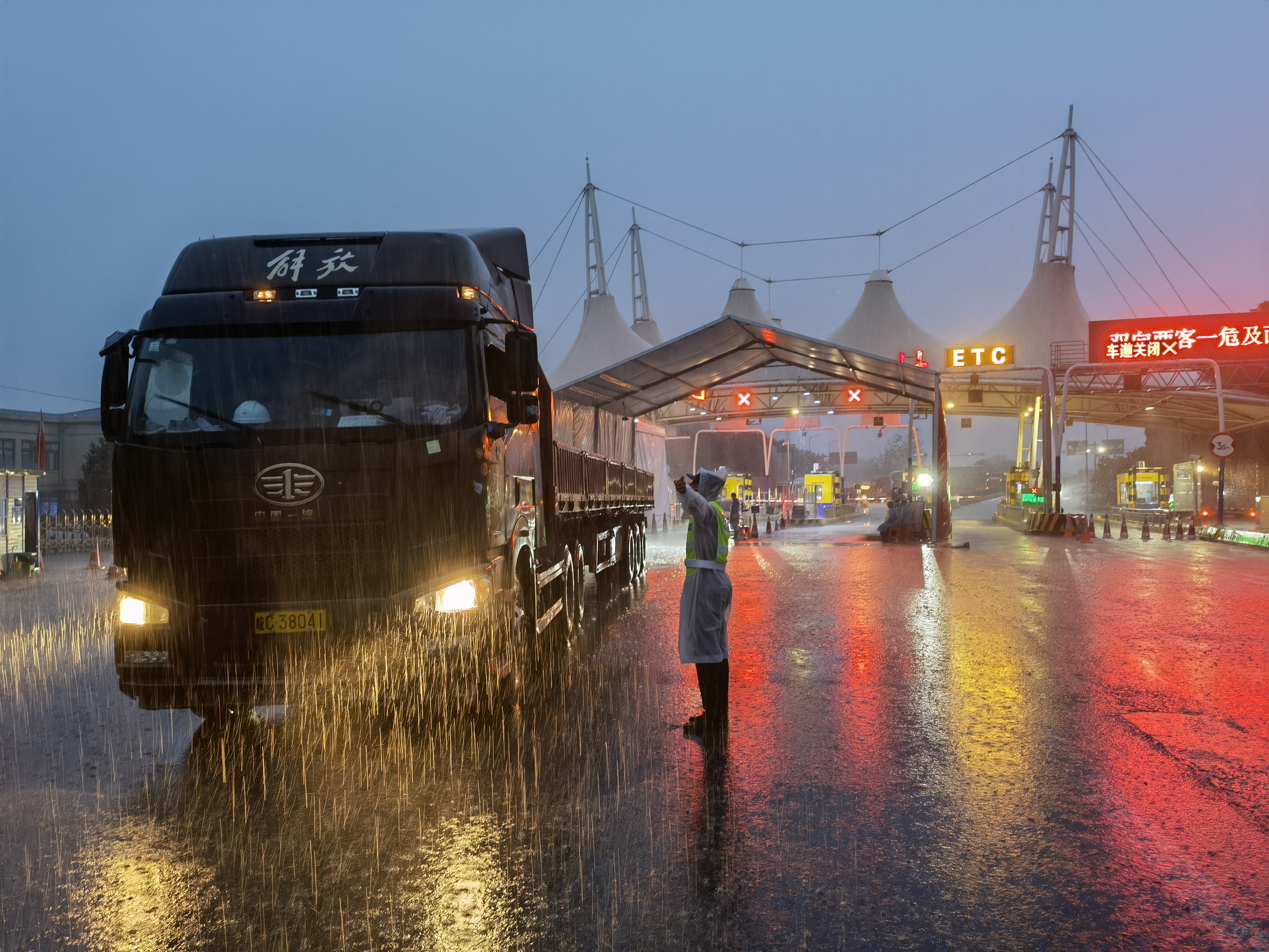 4月25日下午2时起,刘彬到傅村高速出口“暖心服务点”值勤,对过往车辆和人员进行核验,坚决守好疫情防控“外防输入、内防输出”的第一道防线。傍晚5时多,今年以来最大规模雷暴大风来袭,市区范围内普降大到暴雨。“暖心服务点”的帐篷被风吹跑,刘彬和同事将帐篷捡回来后,发现已散架。无处躲雨,刘彬穿着雨衣,坚守在出口,大雨很快将他的衣服淋湿。