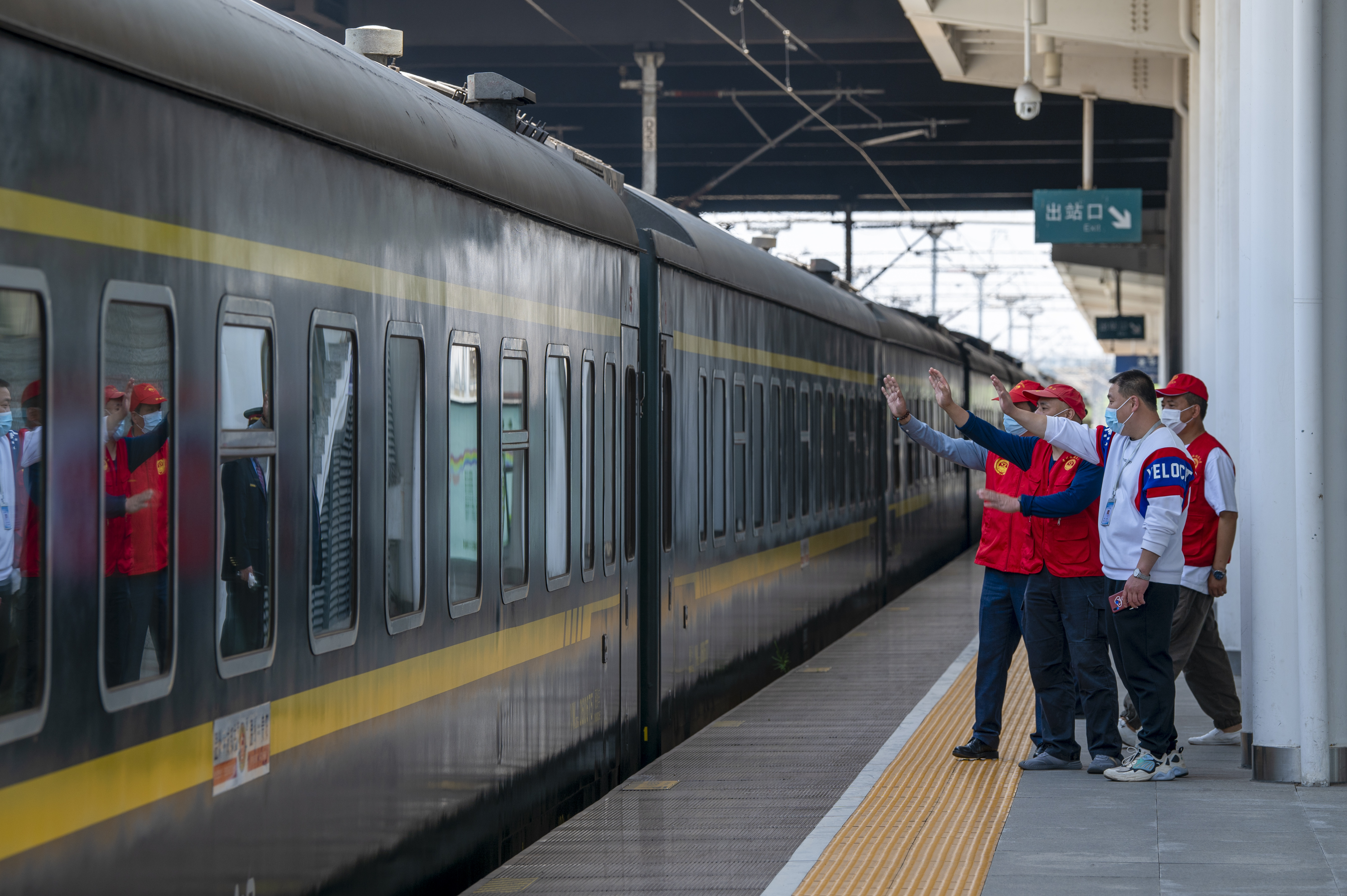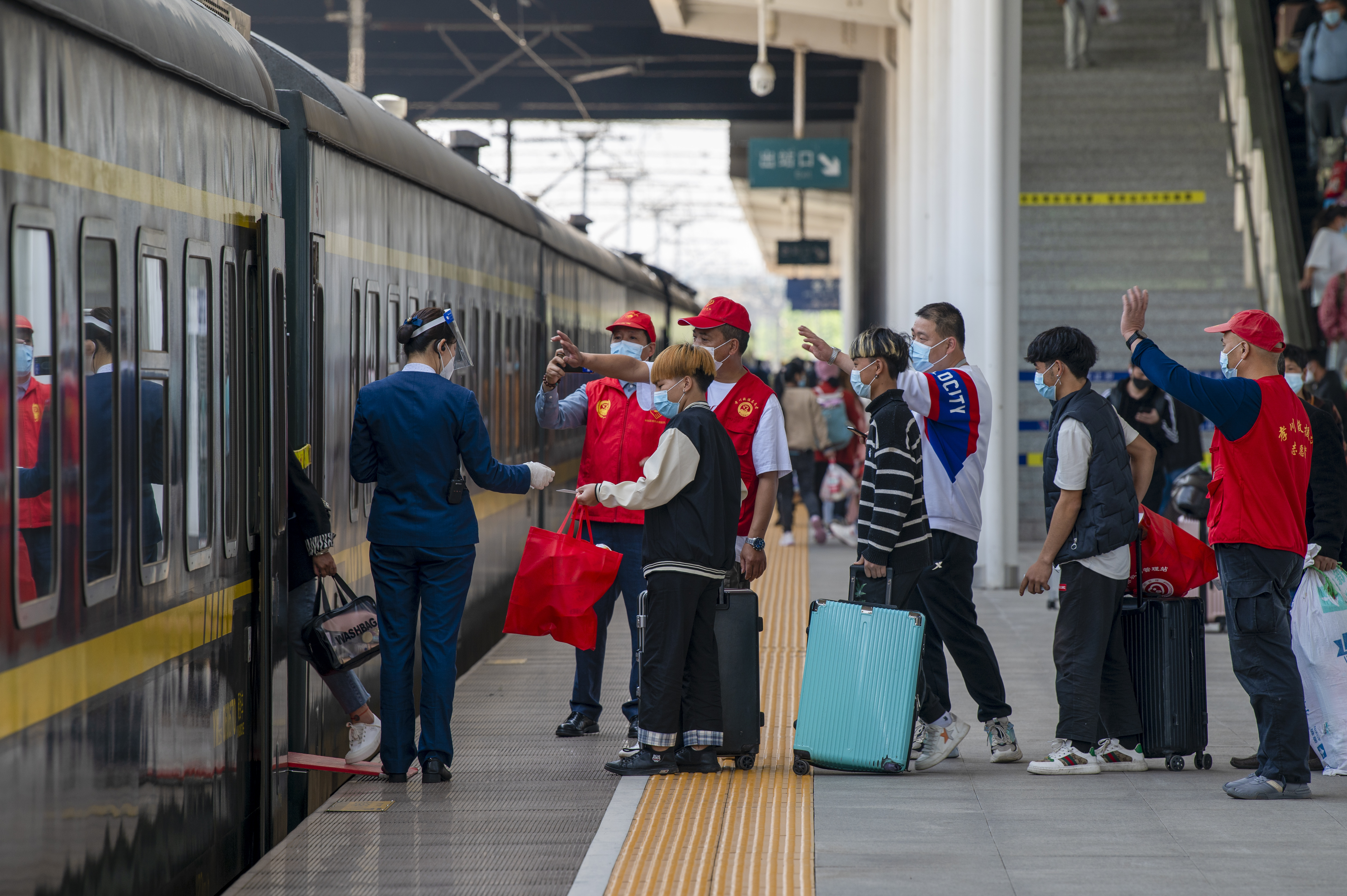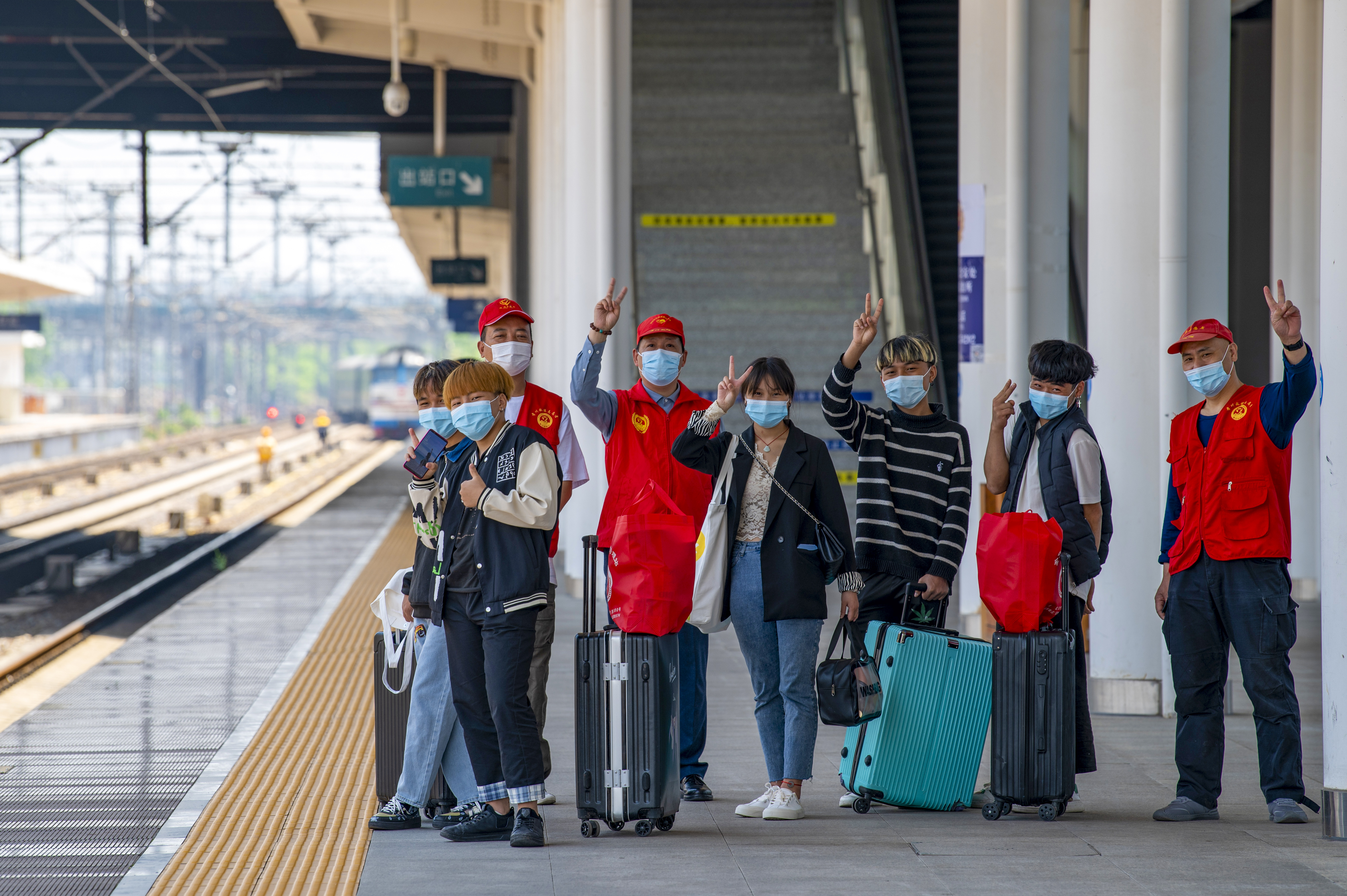 5月3日中午,铁路金华站站台上,5名贵州青年在热心人士护送下,安全乘上列车,踏上温暖回家路。