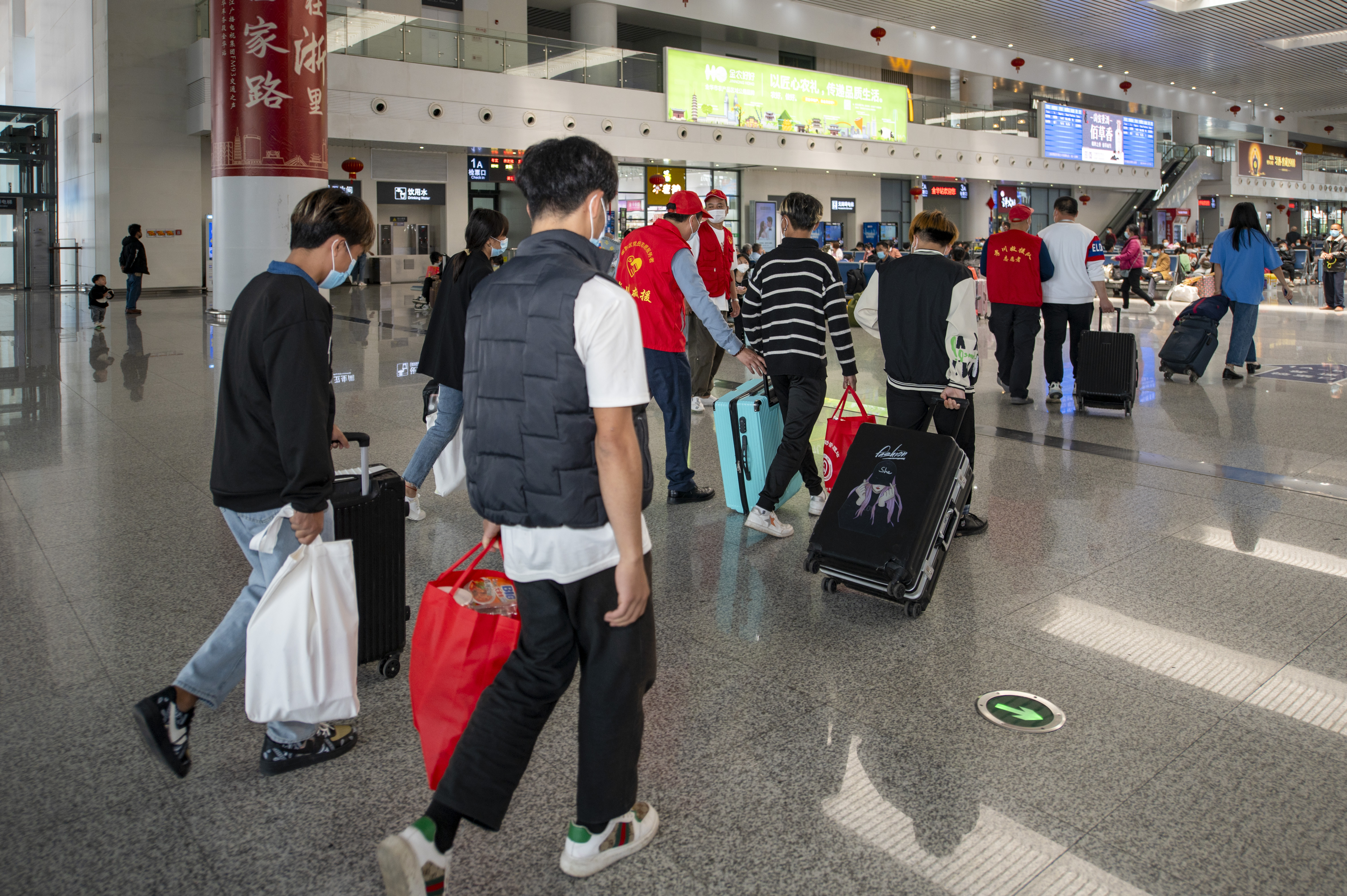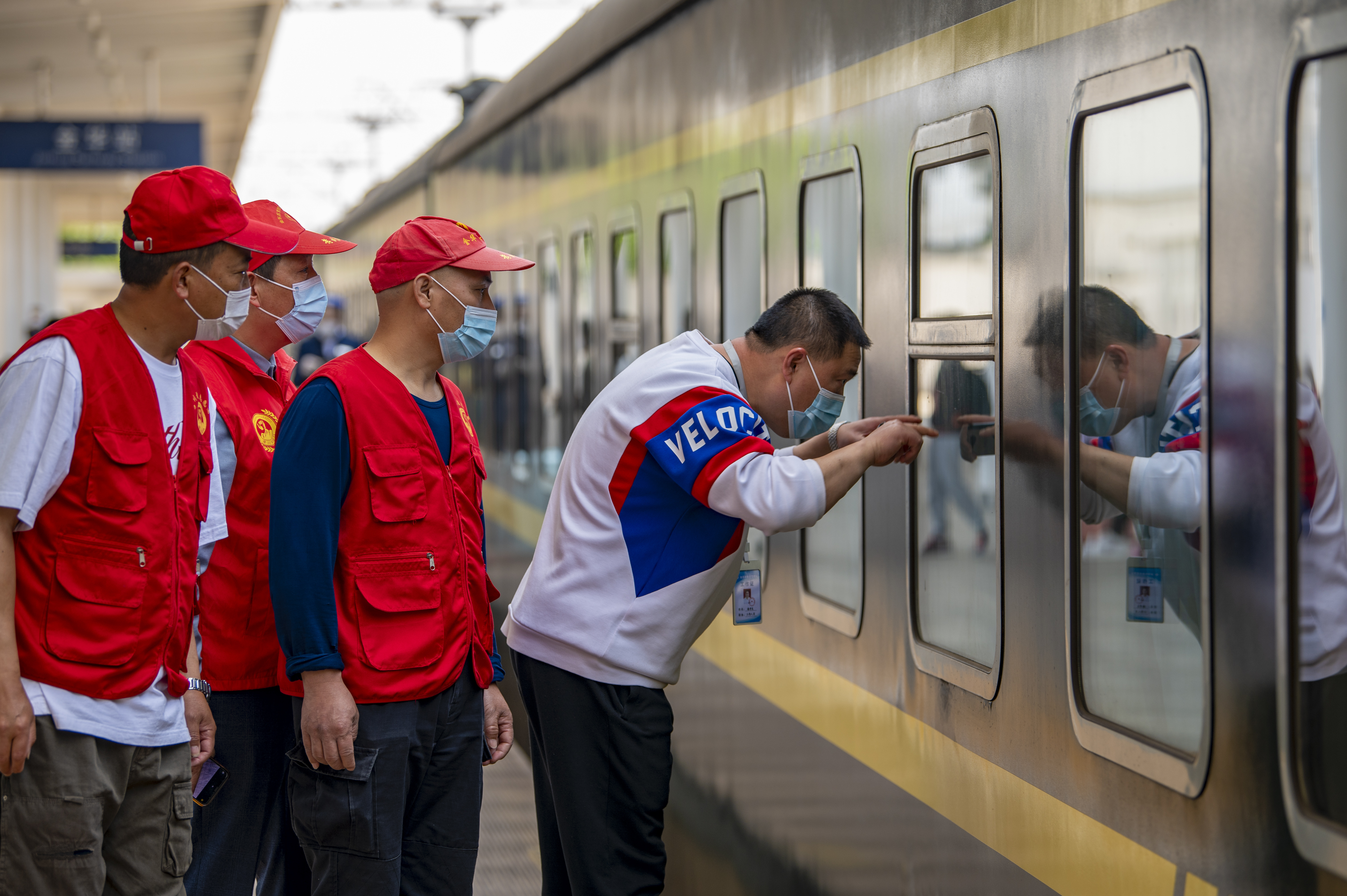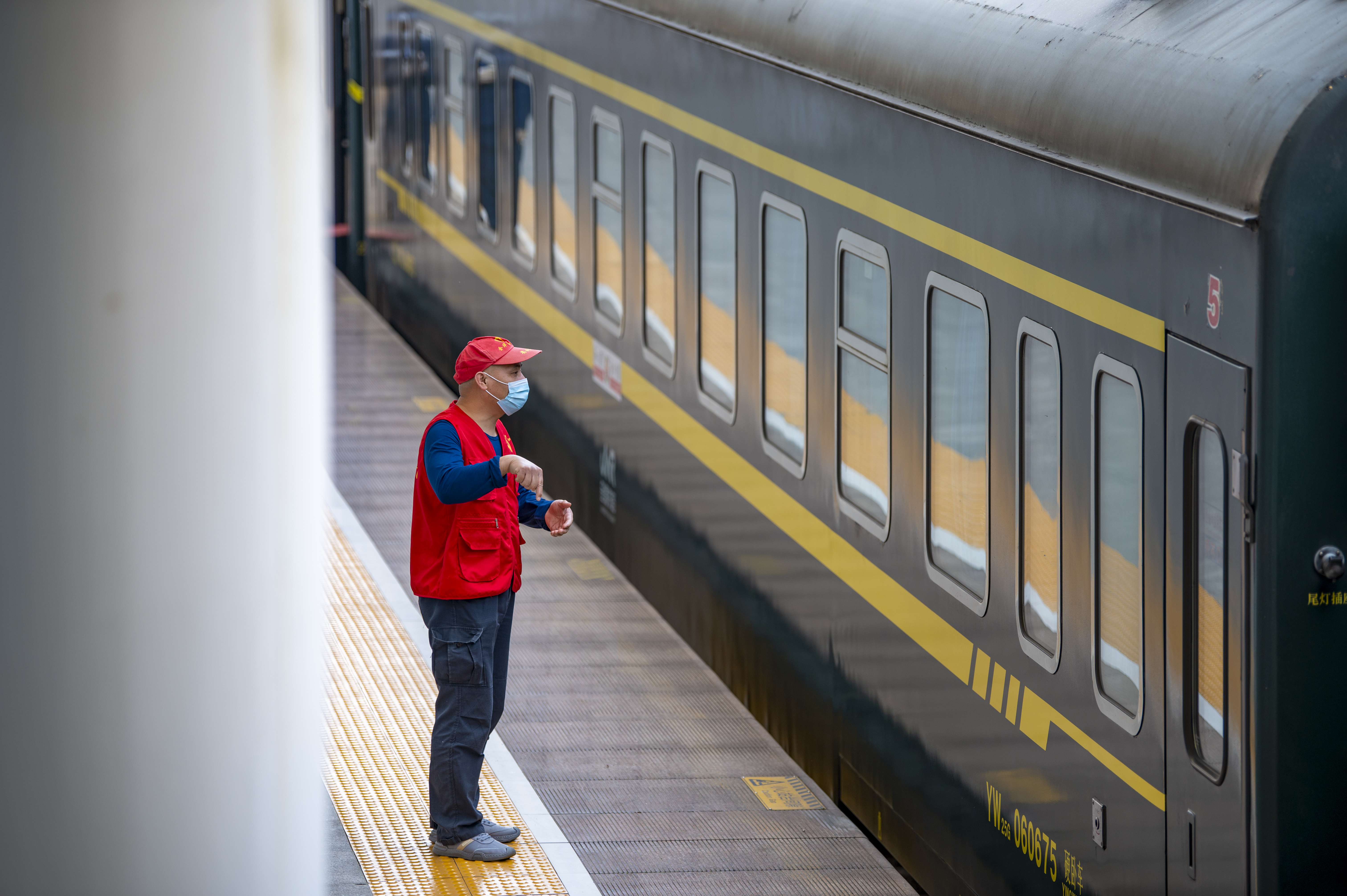5月3日中午,铁路金华站站台上,5名贵州青年在热心人士护送下,安全乘上列车,踏上温暖回家路。