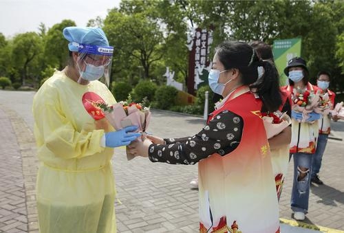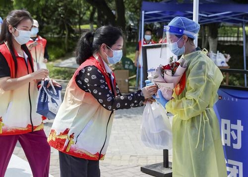 5月8日,东阳市吴宁街道节庆广场便民服务核酸采样点迎来了一批爱心人士,他们是东阳市梦想公益志愿者协会的志愿者。据了解,5月8日是母亲节,因为疫情的原因,许多母亲奋战在抗疫一线,无法陪伴在家人身边。为此,志愿者带上鲜花和爱心饮料,为在核酸采样点执勤的母亲们送去节日的祝福,为她们的坚守点赞。